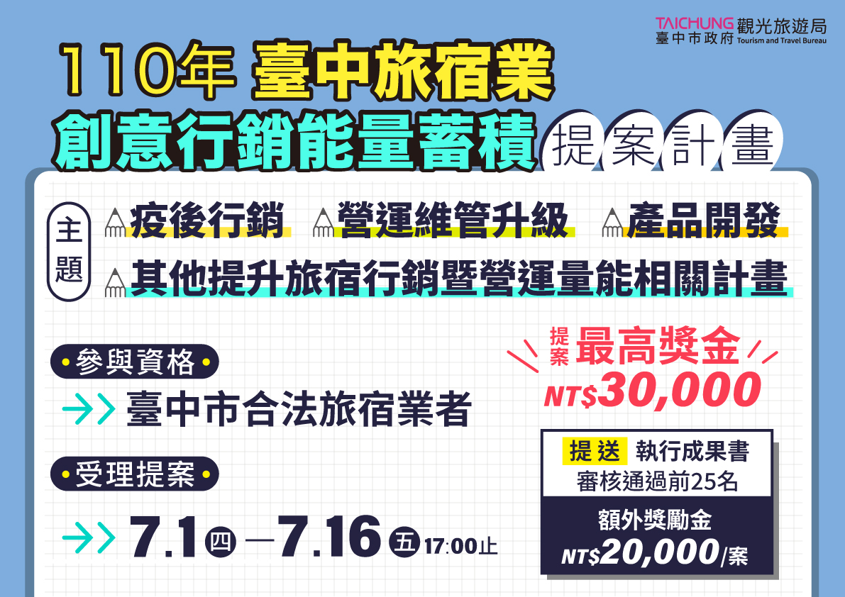 觀旅局表示,推出「台中旅宿業創意行銷能量蓄積計畫」,希望鼓勵業者積極研提疫後振興計劃,盤點及儲備能量,蓄勢待發;凡是台中市合法設立旅宿業者均歡迎提案參與,提案可採紙本投遞或電子郵件寄送辦理,受理期間自71日至16日止,提案計畫主題可包含疫後行銷、營運維管升級、產品開發、其他可提升旅宿行銷暨營運量能相關計畫等,並依評審結果核定獎金,每項提案最高金額為新台幣3萬元,評審結果預計7月底公布。