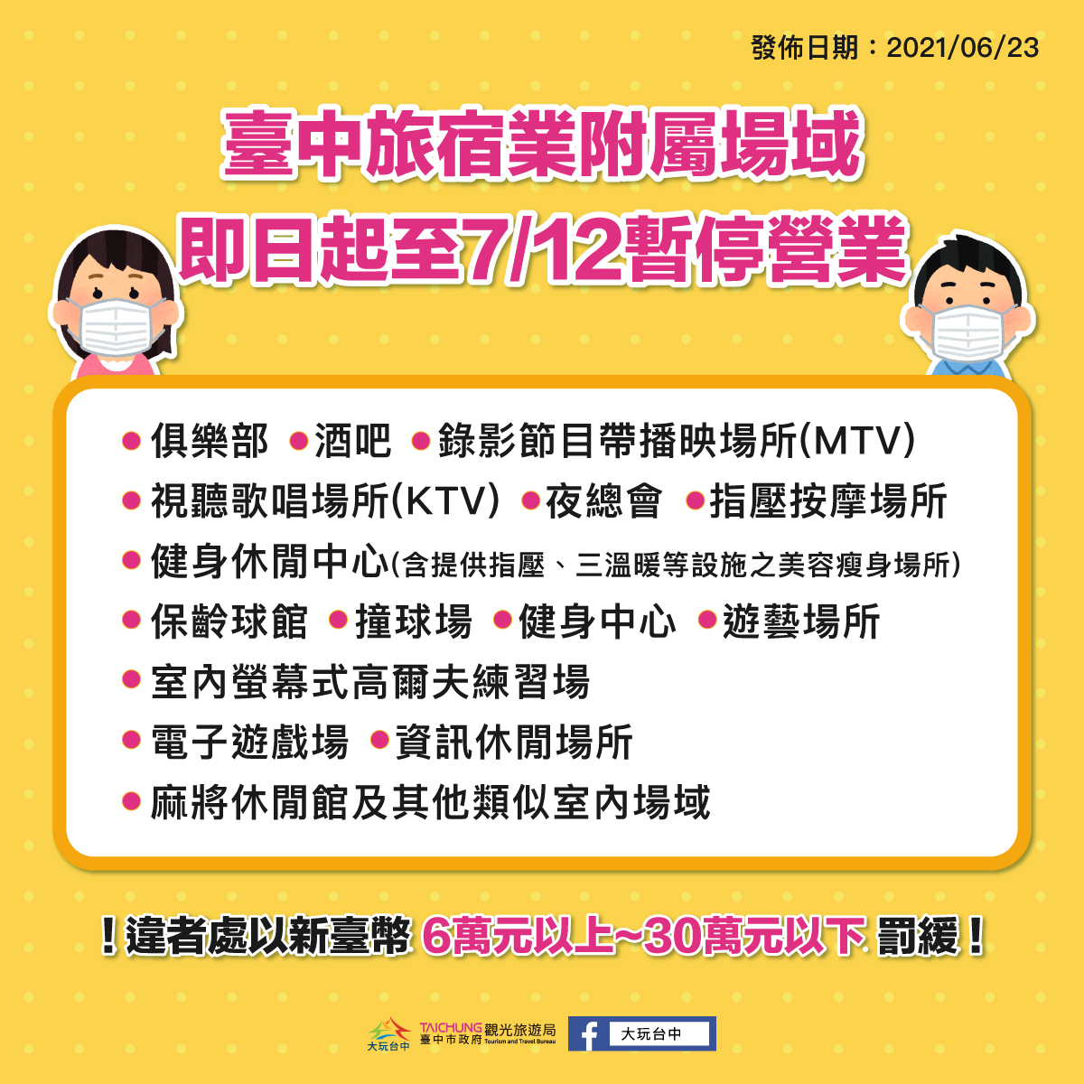 觀旅局補充,為避免造成防疫破口,台中旅宿業附屬場域也持續暫停營業至712日,包括俱樂部、酒吧、錄影節目帶播映場所(MTV)、視聽歌唱場所(KTV)、夜總會、指壓按摩場所、健身休閒中心(含提供指壓、三溫暖等設施之美容瘦身場所)、保齡球館、撞球場、健身中心、室內螢幕式高爾夫練習場、遊藝場所、電子遊戲場、資訊休閒場所、麻將休閒館及其他類似室內場域)。請民眾配合暫緩涉足,以確保自身及他人安全,共同為防疫盡一份心力。草悟廣場富地市集暫停營業至110630日,後續將進行內部整理。