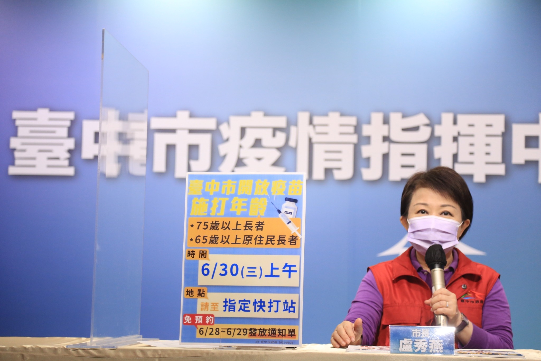 台中市前兩日開放77歲至79歲長輩施打疫苗,市長盧秀燕今(26)日再宣布,6月30日上午將開放75歲至76歲長輩、原住民65歲以上長輩接種疫苗,預計下周一、二由里鄰長發放施打通知單;另外,配合中央指示殘劑開放施打,她也提出台中市殘劑施打「三公原則」,即施打公平、預約公開、名單公布,請各醫療院所、衛生所及快打站遵循此原則執行。