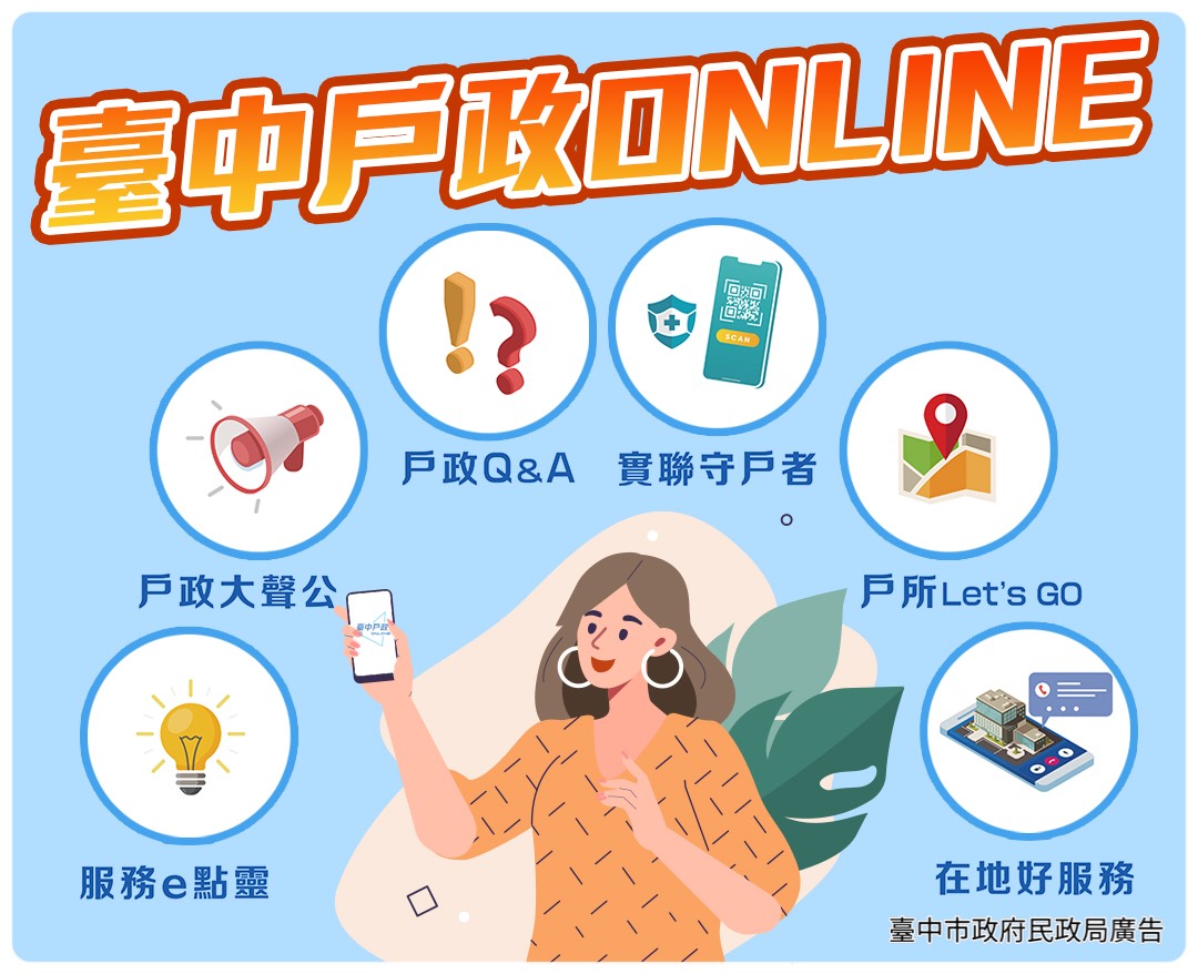 民政局指出,「台中戶政ONLINE」官方平台提供6大功能服務,「戶政大聲公」透過圖文推播,宣導各項戶政業務及重要政策,並即時更新戶政法規資料;「戶政Q&A」自動回應機器人,即時解決民眾一般洽辦之戶政相關問題,也貼心提供台中市人口統計問答查詢;而「戶政Lets GO」及「在地好服務」並提供台中市及全國跨區戶政機關通訊指引及鄰近戶所導航;此外,「服務e點靈」整合了台中市服務e櫃台、台中市戶政規費查詢、台中e指通數位市民平台、台中市人口統計平台及內政部戶役政線上申辦等連結服務。