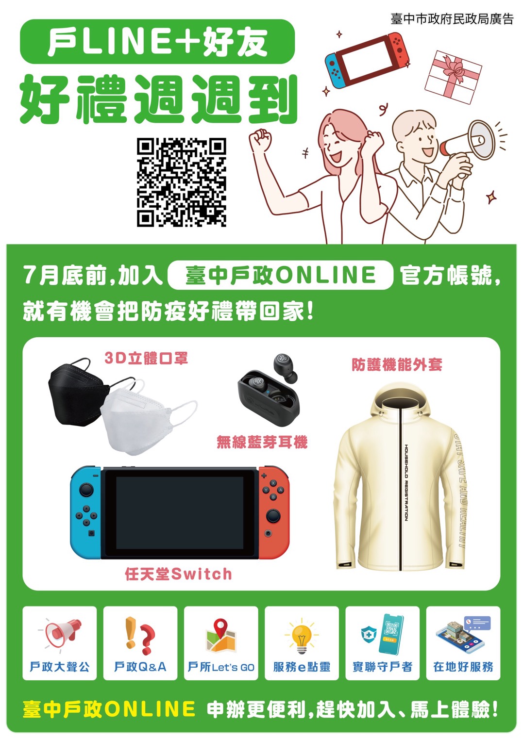 民政局長吳世瑋表示,「台中戶政ONLINE」擴大服務對象至全台中市,甚至跨縣市戶政整合性服務,其中6大主題功能,並根據第一線戶政人員長期服務經驗,站在民眾實際需求設計規劃,今(1)日至730日加入官方帳號好友,即有機會獲得任天堂switch主機、紀念款專屬防護外套、藍芽耳機、防疫3D立體造型口罩及乾洗手攜帶組等多項豐富好禮,歡迎民眾多加利用。