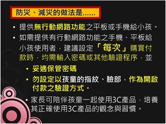李善植表示,在疫情推波助瀾下,家長把手機、平板交給孩子使用,已屬常態。但小孩往往趁大人未注意時,偷偷玩線上遊戲,甚至亂買高額儲值遊戲或遊戲道具;等家長收到電信帳單或信用卡帳單時,才驚覺荷包大失血,也才察覺孩子不當使用3C產品。李善植局長說,手機門號是由大人申辦,門號持有者便有保管手機密碼及信用卡線上交易相關啟用認證碼的責任。因此,呼籲家長應設置手機APP付費密碼,切勿便宜行事,取消輸入密碼的步驟;更不可將孩童的指紋或孩童臉部,作為密碼驗證方式,否則等同將提款卡及密碼交給孩子,事後恐怕難以用「手機是孩童所誤按」而完全卸下已在線上消費的責任。