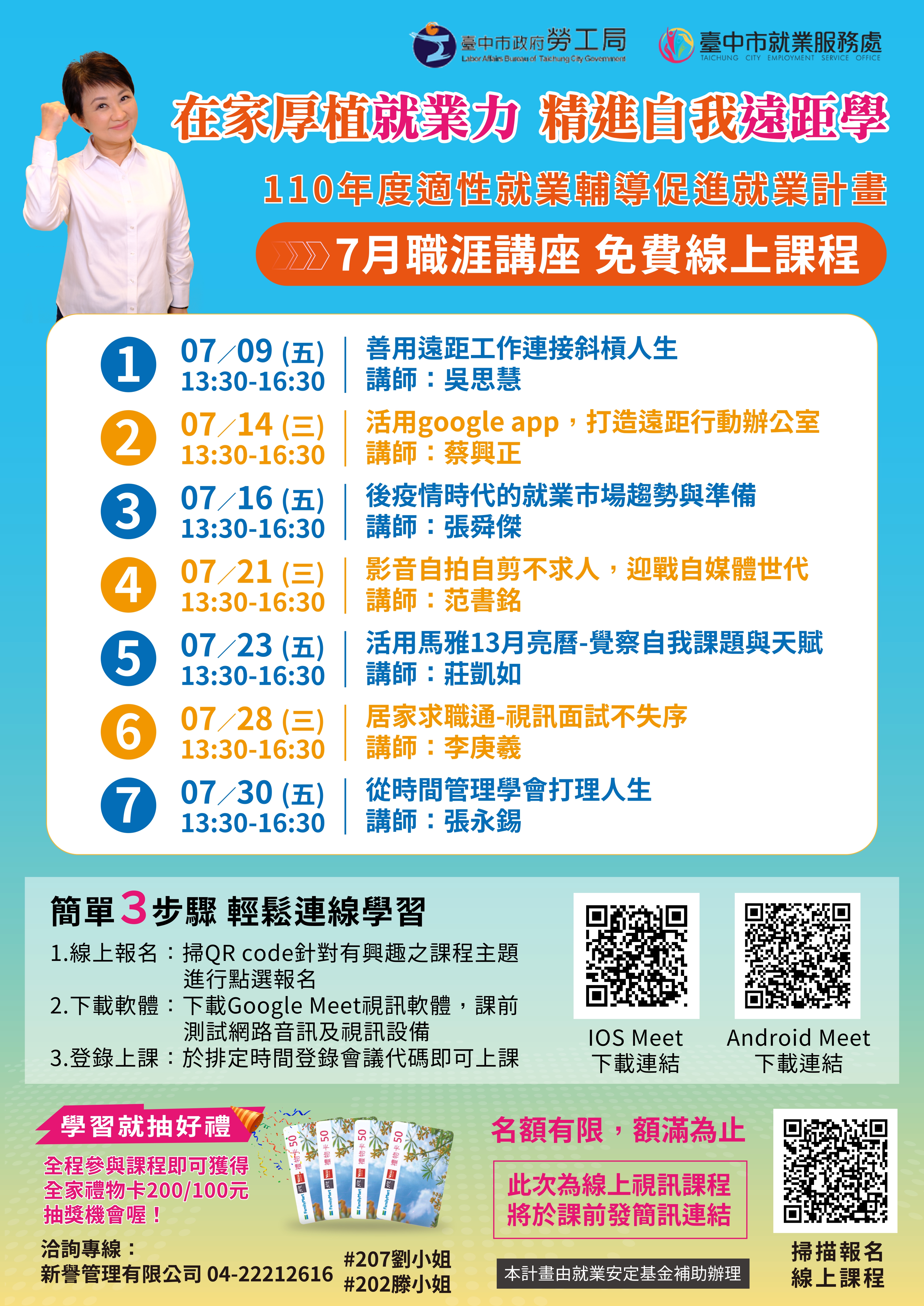 勞工局長張大春表示,市長盧秀燕相當重視就業議題,6月底已率先推出全國首創「視訊徵才2.0」服務,7月更開辦「線上職涯講座」,讓市民於防疫期間,達到「在家厚植就業力 精進自我遠距學」的效果,全程參與者,還可參加抽獎。