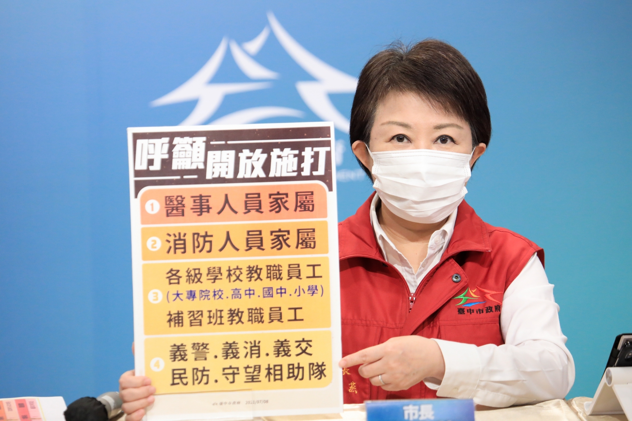 盧市長也說,除教職員工外,包含醫事人員家屬、消防人員家屬因接觸風險大;另,微解封也會造成市民活動變多,義警、義消、義交、民防、守望相助隊等,許多社區工作第一線人員也都紛紛向市府表達施打疫苗的需求,她也再度「為民請命」向中央呼籲,若中央疫苗數量足夠,可逐步開放更多對象施打,希望中央聽見地方的聲音提早規劃,提高國家整體防疫力。