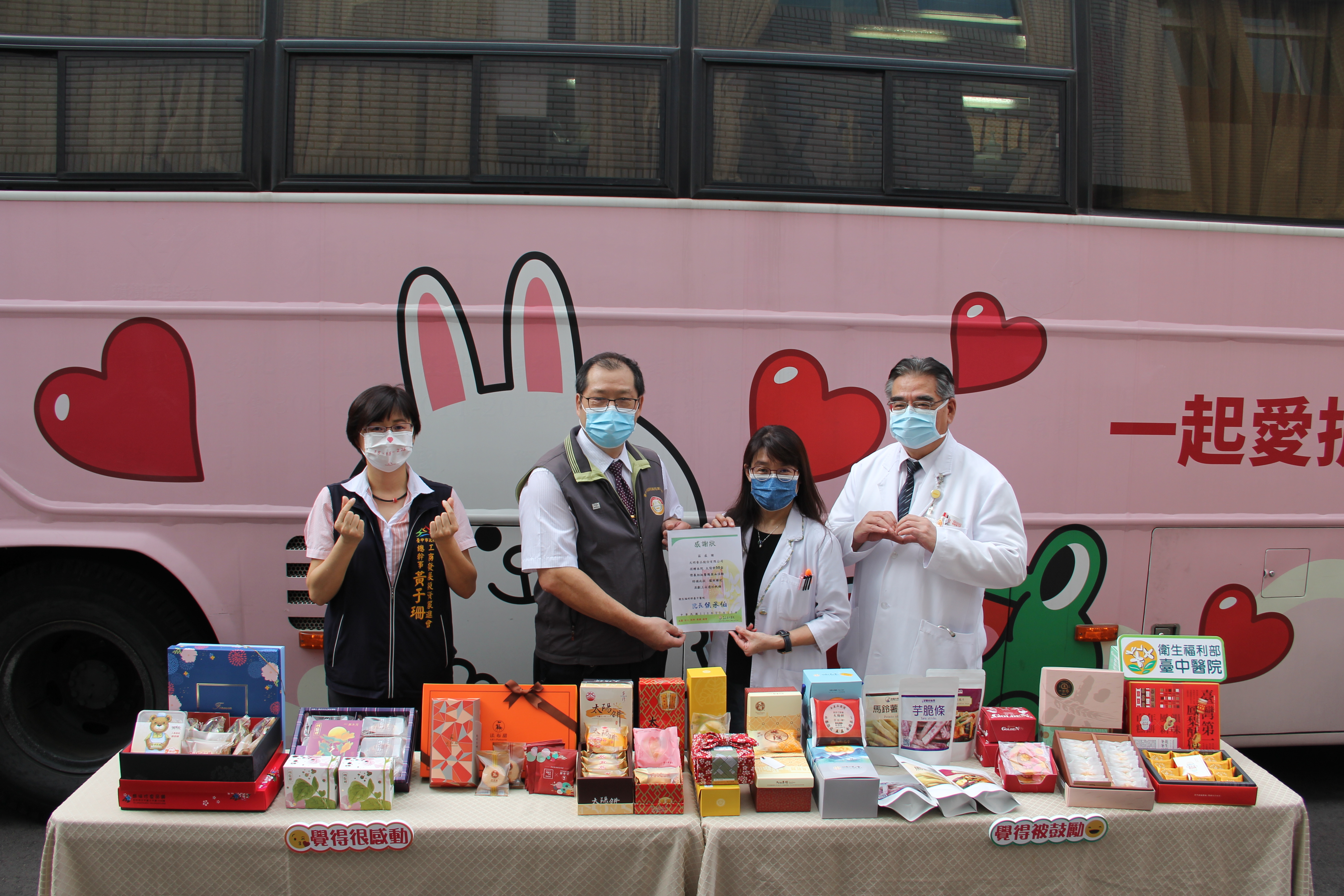 台中市糕餅商業同業公會理事長蔡萬財表示,疫情雖然影響糕餅業者的生意,卻不影響大家想為台灣盡一份心力的心,業者都十分感謝醫護人員不但站在台灣防疫的第一線,更在施打疫苗後主動挽袖捐血。此次活動號召12家在地糕餅業者包括元明商店、九個太陽、法布甜健康伴手禮、如邑堂、太陽堂食品企業有限公司、鮮味珍食品舖、陳允寶泉食品、一米麥、阿聰師的糕餅主意、芋樂大世界、顏新發餅舖以及久久津乳酪本舖等捐贈物資,慰勞辛苦的醫護人員。