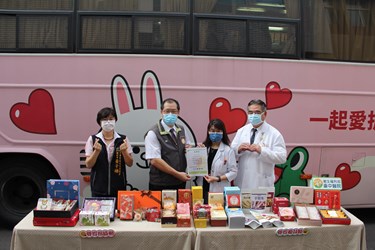 自疫情升級三級警戒後,民眾捐血意願降低,導致血庫存量告急,衛生福利部台中醫院號召院內已完成疫苗接種的醫護人員率先挽袖捐血。今(15)日由台中市工商發展投資策進會、台中市糕餅商業同業公會聯合響應醫護捐血活動,邀請糕餅業者暖心相挺,總計募得600盒糕餅慰勞第一線醫護人員。