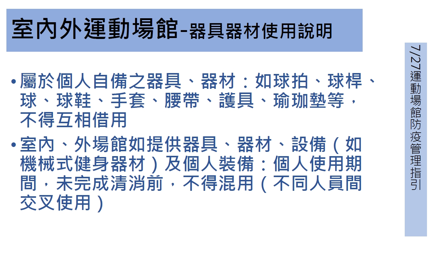 運動局說明,依據教育部體育署公告,適度開放對象為商業登記屬「競技及休閒運動場館業」的私人室內、外運動場館(游泳池除外),但各場館附屬設施,如淋浴間、三溫暖、蒸氣室、烤箱等仍不得開放。