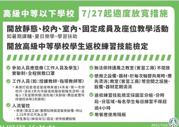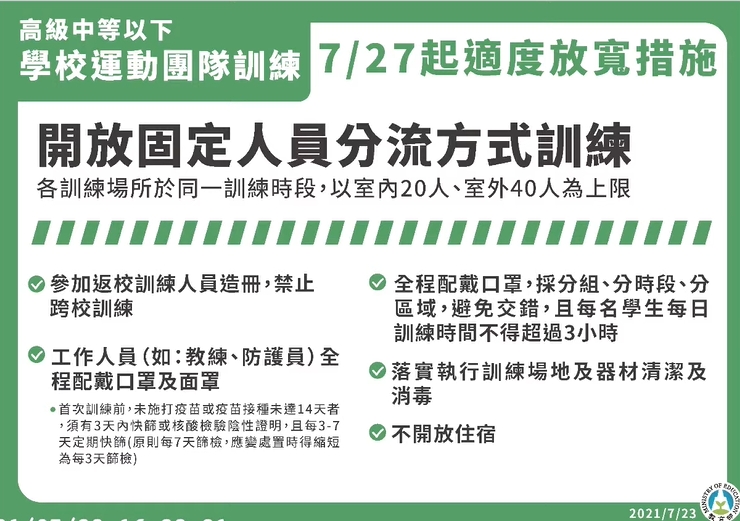 另外,國民運動中心、港區運動公園(不包括所轄游泳池及跳水池)配合防疫規定及防疫管理指引得開放使用;公立戶外運動場域方面,若現場有專人管理,可落實並管控實聯(名)制者,得開放使用;步道、操場或田徑場等屬走動式不接觸設施亦開放使用,但附設兒童遊具或體健設施等因難以保持社交安全距離、即時消毒及落實實聯(名)制,仍暫停開放。
