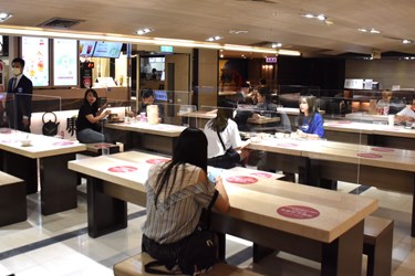 中友百貨副店長陳俊華表示,百貨公司遵循各級防疫規定,積極落實顧客衛生防護措施,民眾須佩戴口罩、入店量測體溫、實聯制,公司亦提供酒精消毒乾洗手,另訂定餐廳設置容留人數,採梅花座或隔板設置方式,確保 1.5 公尺安全防疫距離;另場所相關服務與工作人員,均落實每日體溫量測及健康狀況監測。