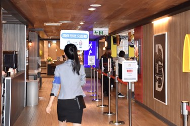張局長說明,昨日查核中友百貨美食街,出入口均有加強人流管理,各點餐櫃位也遵循防疫相關規定定期消毒,美食街用餐座位採梅花座間隔,同時設置隔板,並確保1.5公尺安全防疫距離,業者落實成效良好。