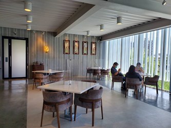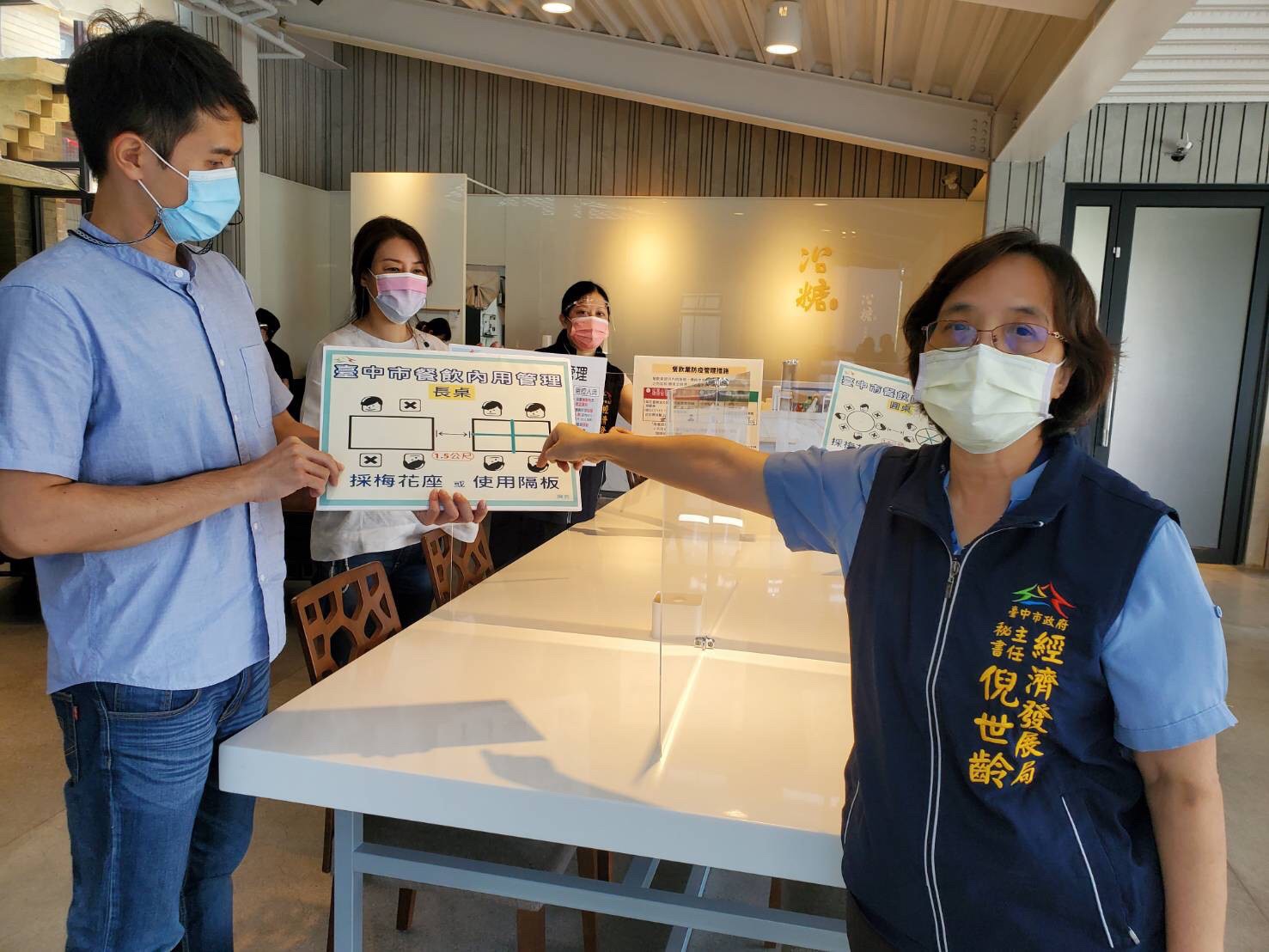 此外,由經發局委外經營的帝國製糖廠台中營業所,業者均遵循內用防疫指引,包括實施入店實聯制、量測體溫與酒精消毒、內用座位隔板等,經量測餐桌間隔皆符合1.5公尺以上距離,同時落實市長盧秀燕要求的內用管理措施,在明顯處張貼店內容張貼容留人數,收銀人員及送餐人員佩戴口罩、面罩「雙罩措施」,此外還在收銀區裝設隔板加強防疫,強化各項防疫措施。