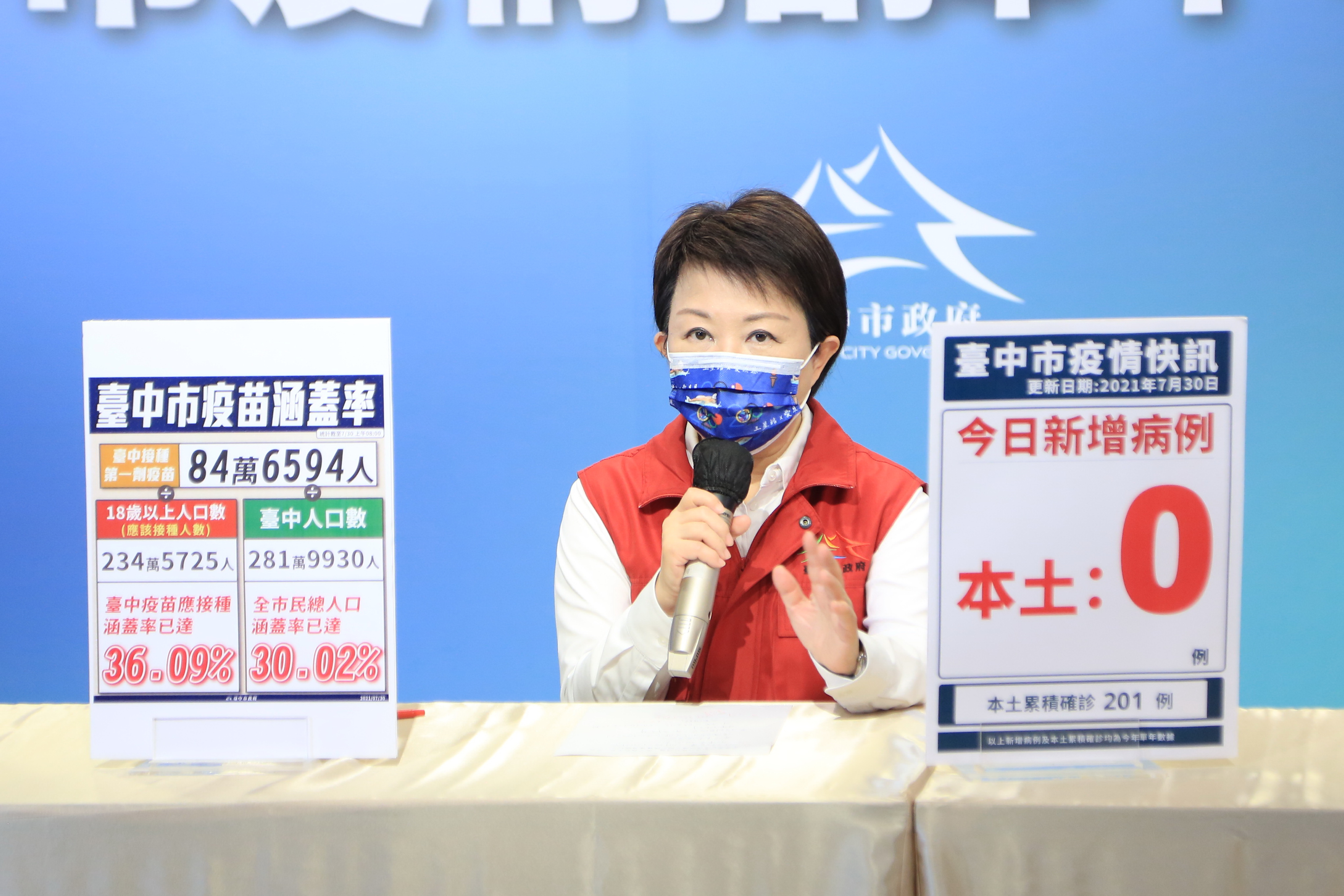 台中市今(30)日本土、境外、快篩陽性「三零」,市長盧秀燕表示,截至目前中市已接種第一劑疫苗達84萬6594人,疫苗應接種率36.09%、總人口數接種率30.02%,均突破三成。此外,台中市流行疫情指揮中心考量全國警戒降級、台中疫情相對和緩,市議會將在下週恢復開議,明日起防疫記者會改為視疫情變化不定期召開,市府全力拚經濟、拚建設、拼市政,同時仍嚴守防疫絕不鬆懈,也呼籲民眾要持續落實防疫規範,共同守護城市安全。