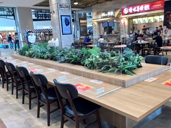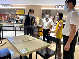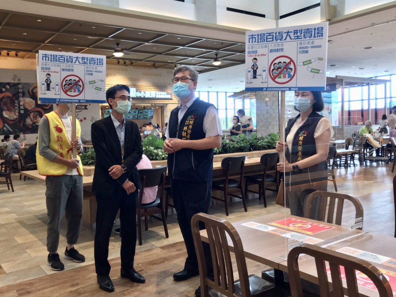 經發局說明,經發局連二日稽查愛買水湳店及台中港三井outlet美食街,業者於美食街內用座位均依規公告容留人數、用餐座位採梅花座並設置隔板、顧客離席後立即清消、並增加公用設施及環境消毒頻率;此外,業者也設置社交距離宣導員,主動提醒顧客隨時保持社交距離。