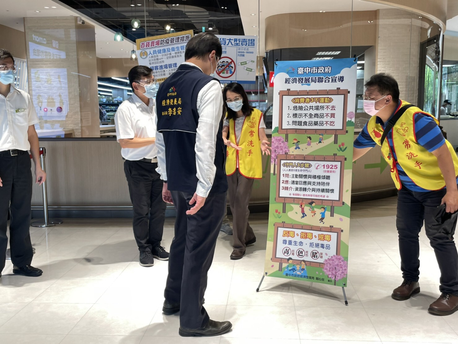 繼先前疫情警戒降二級首日,台中市政府經發局長張峯源帶隊查核中友百貨美食街後,經發局在降級首次週末前,7月29、30連二日再由副局長李逸安、專門委員林敏棋分別前往愛買水湳店、台中港三井outlet美食街查核。經發局表示,市府連日來查核情況良好,業者均依百貨指引落實各項防疫措施,週末百貨賣場美食街人潮較多,呼籲民眾務必落實防疫,切勿鬆懈,確保消費安全。