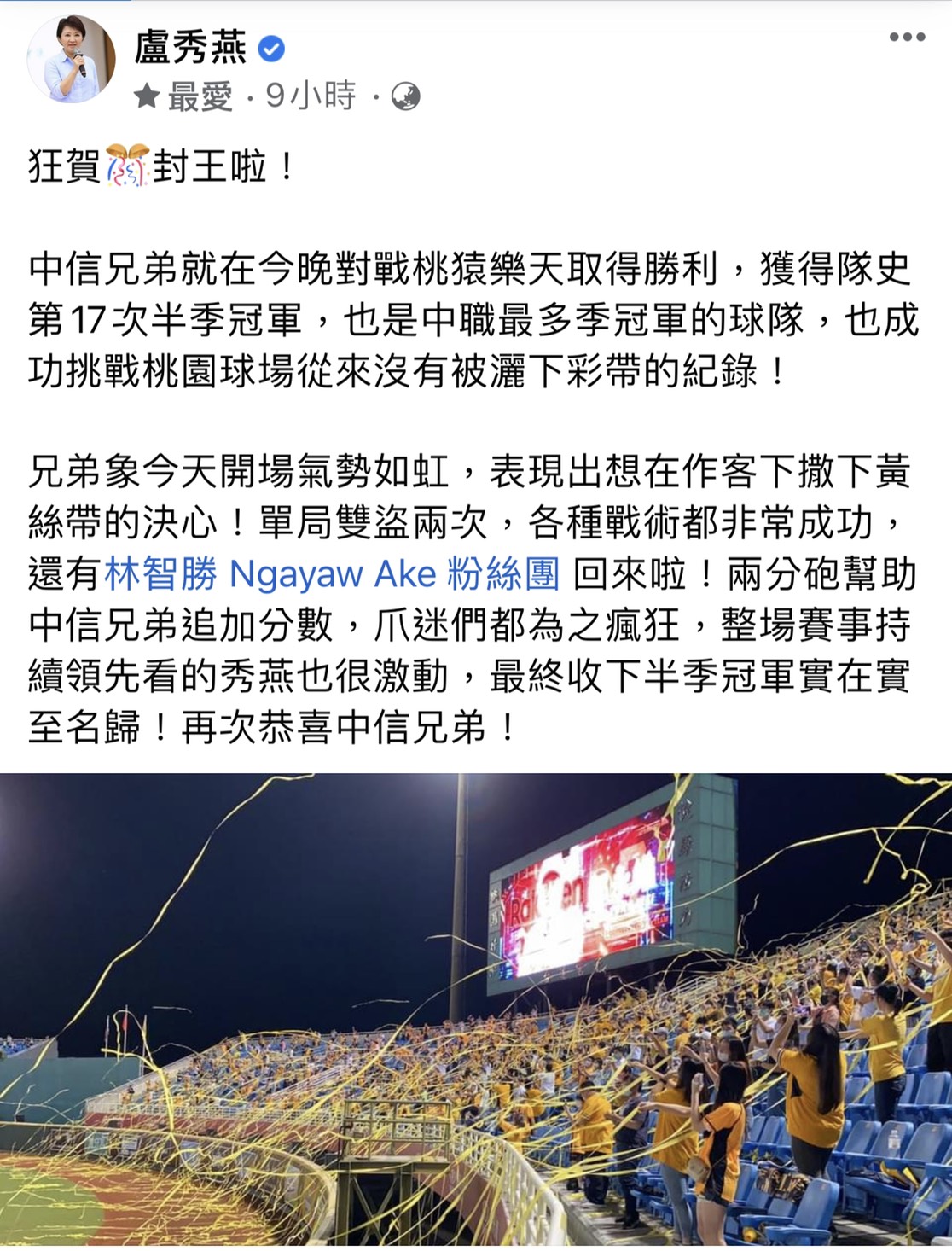 盧市長第一時間於臉書發文恭賀中信兄弟上半季封王,她指出,中信兄弟昨晚對戰樂天桃猿,開場氣勢如虹,表現出爭冠決心,各種戰術都非常成功,爪迷們都為之瘋狂,整場賽事持續領先看得十分激動,最終兄弟隊獲得隊史第17次半季冠軍,也是中職最多季冠軍的球隊。
