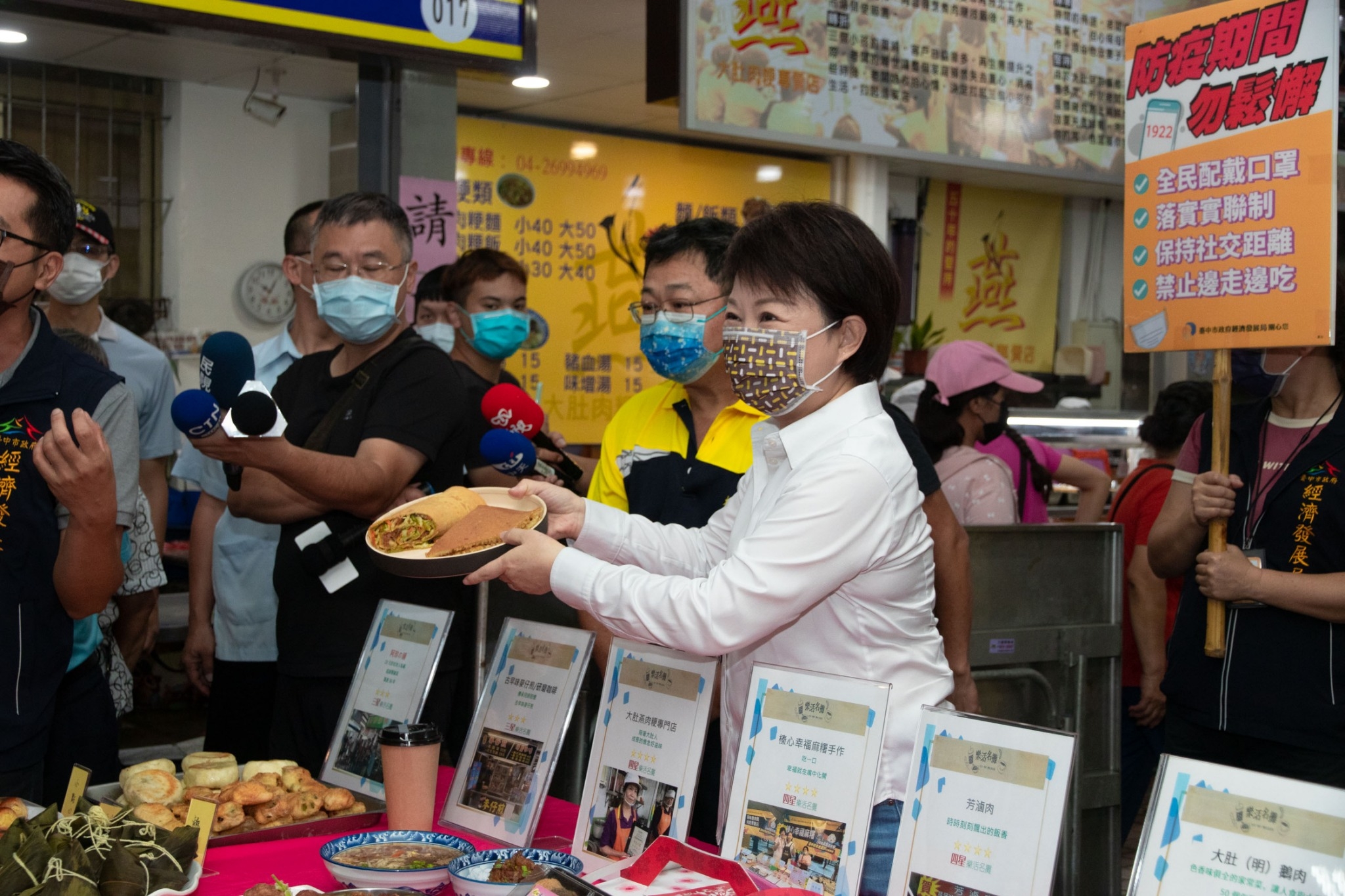 經發局指出,大肚市場為落實防疫,在入口處安排人員控管人流,並嚴格要求民眾全程佩戴口罩及落實實聯制等防疫措施,另市場也設置社交距離宣導員,走動呼籲採買民眾注意社交距離。今年在疫情嚴峻考驗下,市場生意雖受到影響,攤商們依然堅持用心經營,並在疫情期間以外帶取代內用、以外送減少群聚,讓所有人在家也能安心享受美食。