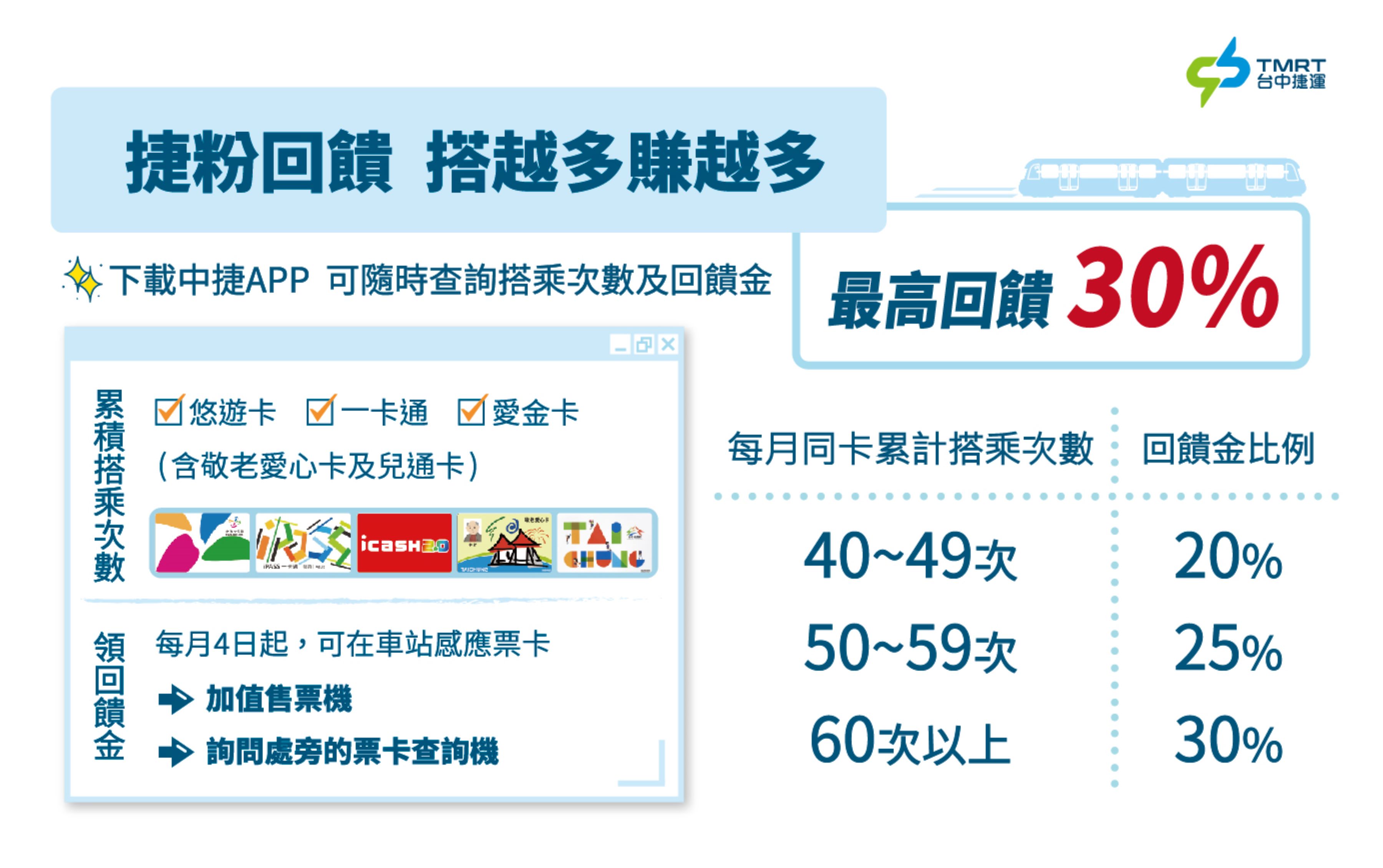 中捷公司表示,捷粉回饋不須事先申請,凡持電子票證(悠遊卡、一卡通或愛金卡)搭乘台中捷運,都可累計搭乘次數;提醒旅客要享搭越多回饋越多的好康,最好養成使用同一張票卡的習慣,才能集中累積搭乘次數並獲得最多回饋金。除一般電子票證適用外,台中市敬老愛心卡,不但搭乘享5折,還可扣點數免費搭,並可累計搭乘次數享回饋;台中兒童卡也可享有搭乘5折優惠及累計搭乘次數回饋。