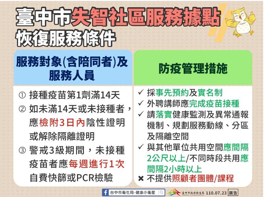 考量失智服務對象及家庭照顧者需求,台中市依據衛生福利部於今年722日訂定「失智社區服務據點因應COVID-19防疫管理指引」有條件恢復服務,凡參加據點活動的長輩及工作人員都應接種疫苗第一劑且滿14日,未接種疫苗或接種第一劑疫苗未滿14日者,首次提供或接受服務前,須自費提供3日內快篩或PCR陰性證明,以維護長輩及工作人員健康;餐飲服務則採分批用餐,以梅花座或使用隔板保持社交距離。