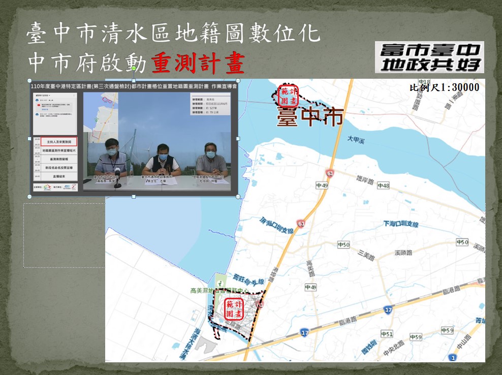 地政局說明,受疫情影響,市府改由線上直播進行地籍圖重測宣導說明會,說明地籍圖重測緣由與法源依據,使重測區內土地所有權人了解地籍圖重測相關程序及規定,並開放民眾上網票選重測後新段名,說明會影音資料已置於網路(龍井區:http://youtu.be/02_1CRY4JKI、清水區: https://youtu.be/AwQbWi4zFSQ),歡迎民眾觀看。