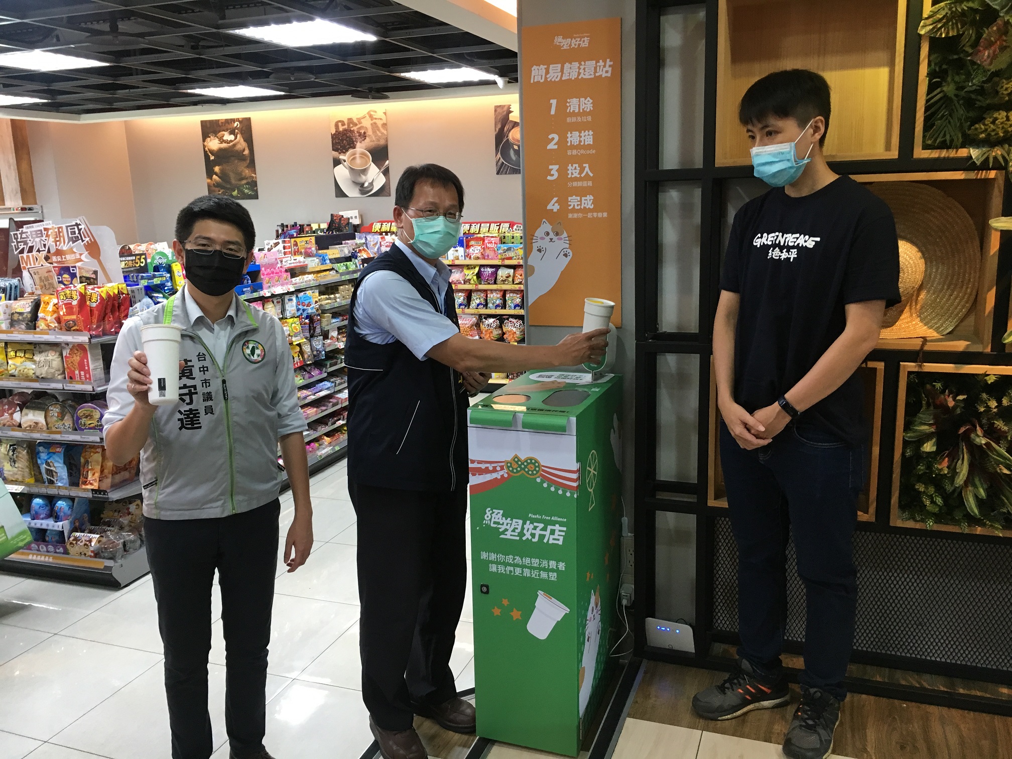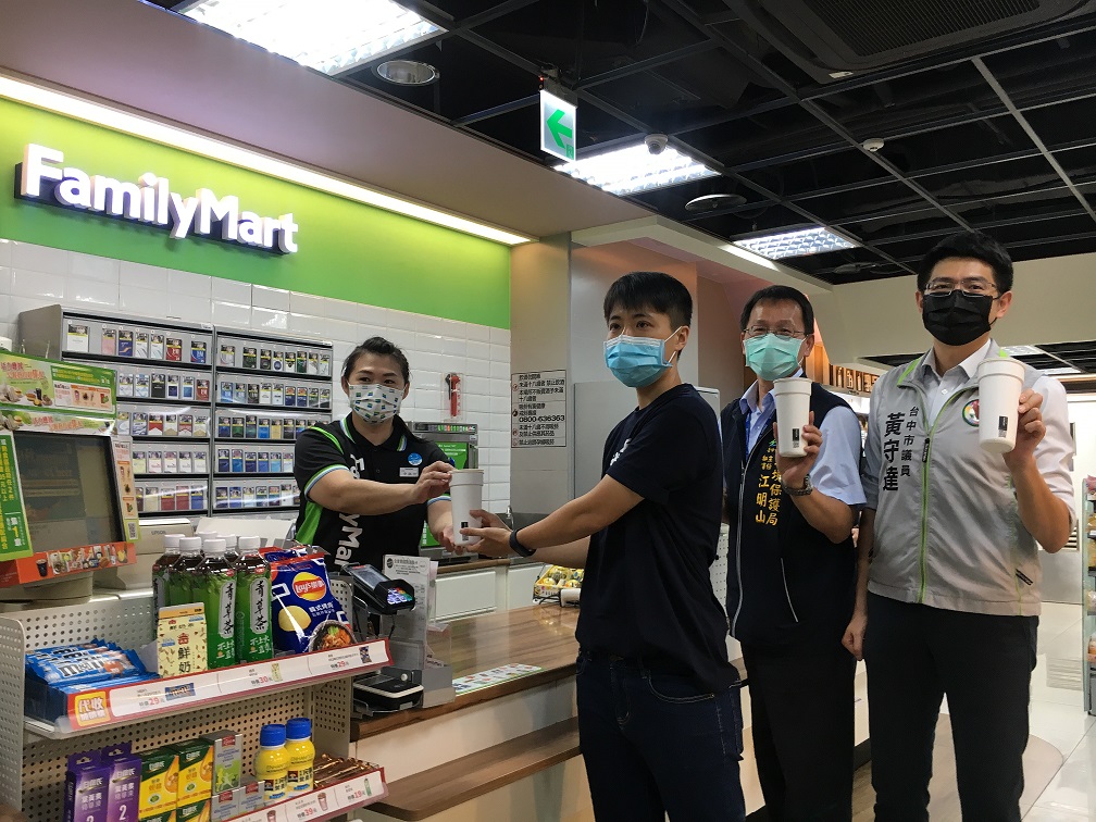 市府環保局今日與「綠色和平」於全家便利商店草悟道店,共同舉辦「推動草悟道商圈循環杯計畫」啟動記者會。環保局表示,「循環杯使用機制」提供免費借用環保杯,民眾使用完不需清洗,可在甲店借、乙店還,或透過設有循環杯歸還機的全家便利商店草悟道店、成真咖啡台中審計店及黃守達議員服務處等3處歸還循環杯,歸還的容器均遵循衛生福利部食品藥物管理署「餐具清洗良好作業指引」加以消毒,除85度高溫蒸氣殺菌45分鐘外,再以遠紅外線消毒櫃進一步消毒。