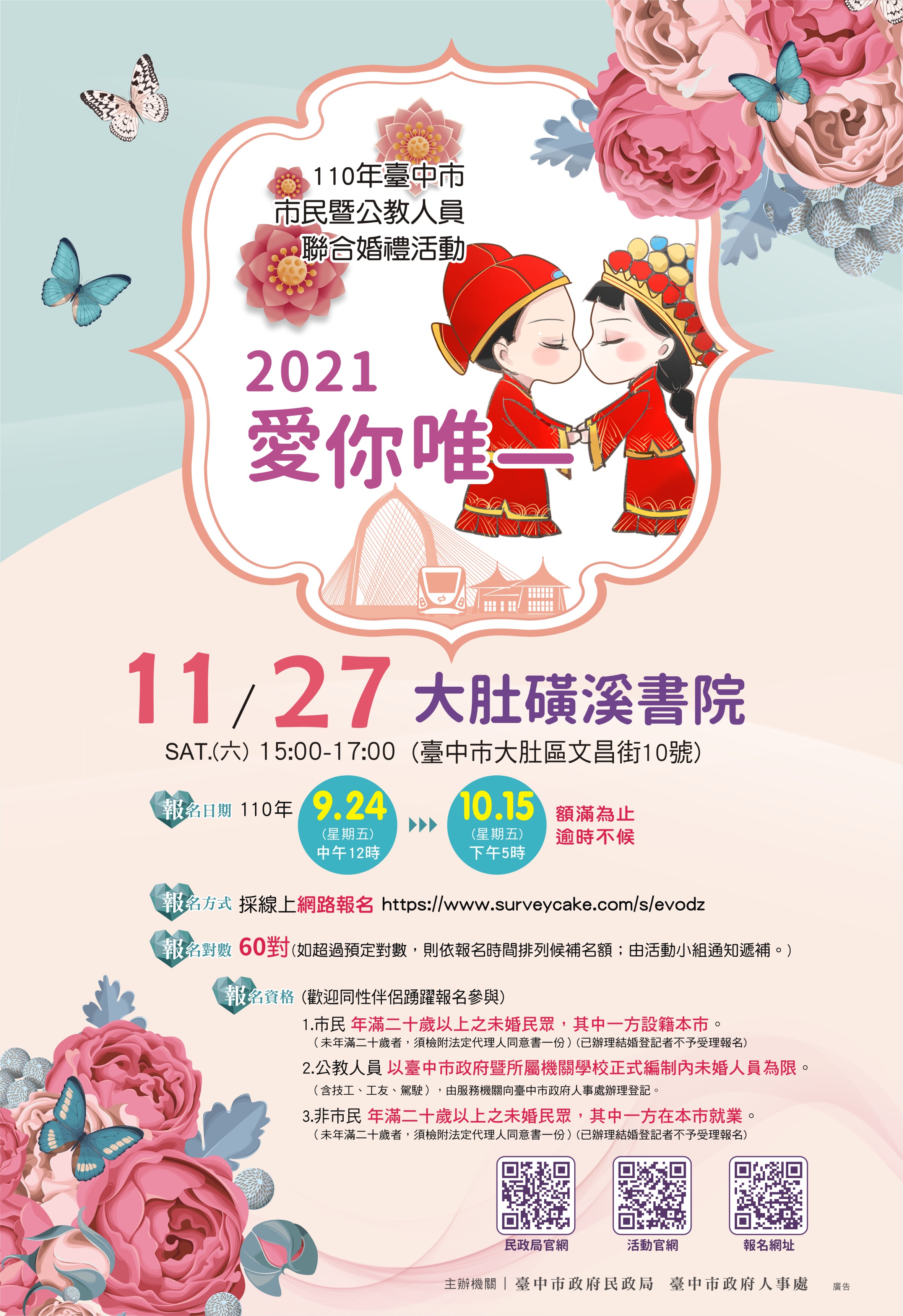 民政局表示,今年活動受新冠肺炎疫情影響,僅開放60對新人報名參加,活動現場並配合各項防疫指引,落實各項防疫措施,請市民安心報名參加。凡在台中市設籍、就業或台中市政府所屬公教人員符合報名資格者,於報名期間內可至民政局官網或活動網站(https://reurl.cc/Q63k9o )線上報名,名額有限,額滿為止。(9/16*8)*民政局