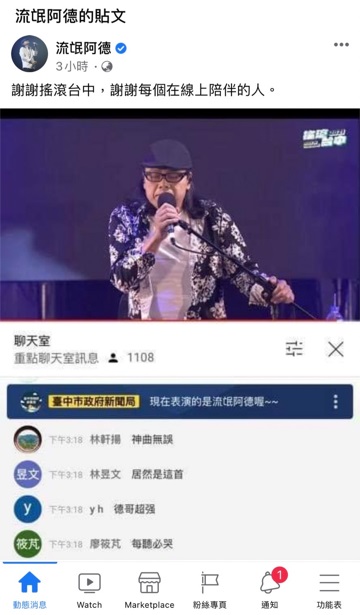 台中在地樂團「BIKE機踏車樂團」主唱育嘉表示,謝謝台中市政府新聞局,讓他們在疫情期間仍然能透過線上直播表演並與大家互動;同為台中樂團的「老破麻」Bass手阿谷跛一隻腳打石膏坐輪椅也要上台甩頭熱血演出,許多網友紛紛表達關心,該團小編也上線一同留言趣味互動,獲得留言區一片好評「開圈了」、「撞起來」、「我要衝浪」。