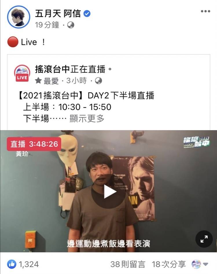 五月天阿信也上線觀看 30萬人次參與搖滾台中