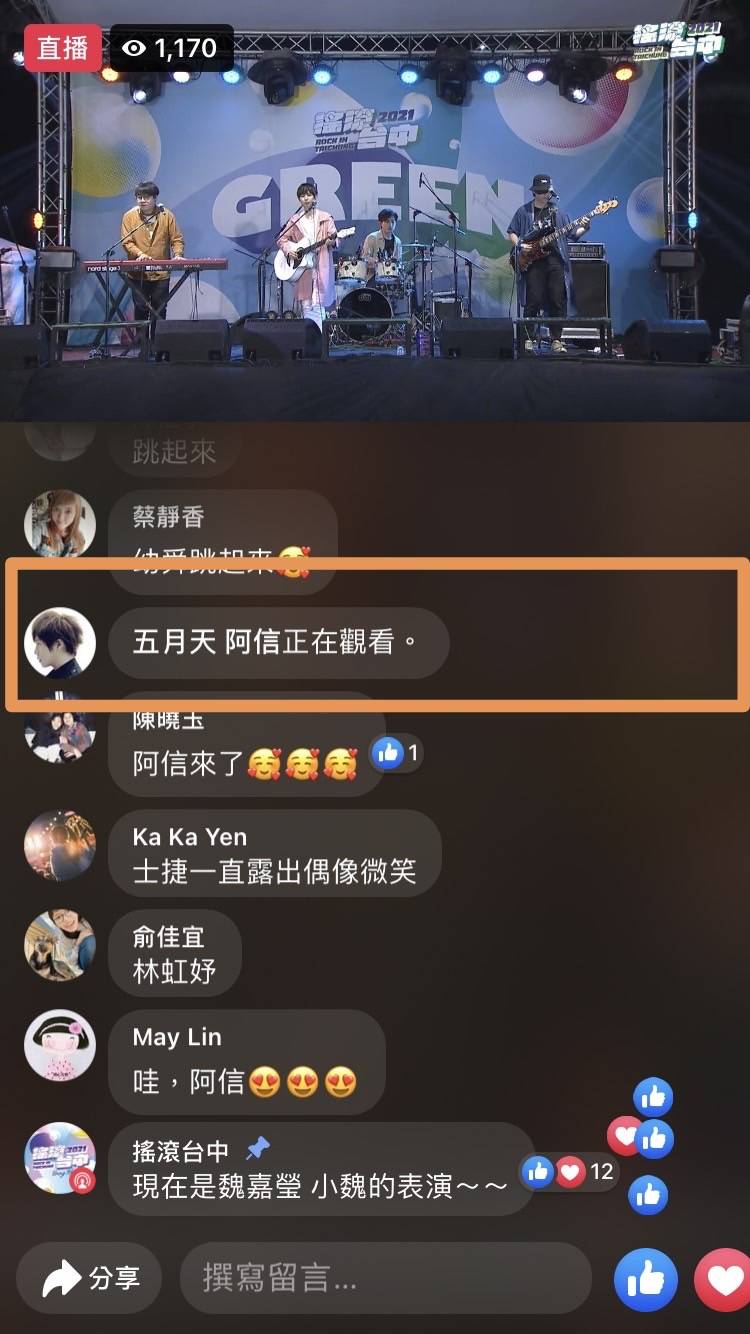 特別值得一提的是,讓新秀增加能見度一直是搖滾台中一大使命,因此今年除了主舞台規格提升外,更新增了以新秀、原創大賽入選、台中在地為主的GREEN舞台,與能量主舞台交叉演出,讓新秀也有機會在好時段演唱,增加曝光度;另外,台中返鄉遊子魏嘉瑩演出,更吸引國內天團「五月天」阿信上線收看,聊天室中的樂迷也嗨翻。