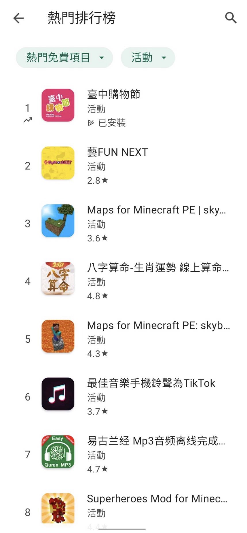 「2021台中購物節」自明(10)日起展開為期2個月,台中市政府搭配中央振興券熱潮,提前舉辦下載專屬購物節APP的早鳥活動,刺激下載量攀升至APP Store旅遊類排行第一名,以及Google Play應用程式平台熱門免費項目的活動類別第一名;經發局表示,截至目前,APP累積下載量近47萬次,顯示民眾對於活動充滿期待,歡迎全國遊客到台中登錄發票、抽大獎。