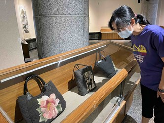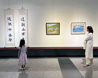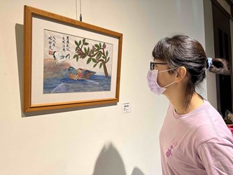林郭愛女士則在其水墨作品《鴛鴦白鶴》中,以古樸簡單的筆法與墨彩,將並肩齊進的一對戲水鴛鴦置於畫心,吸引眾人目光,再於畫面右上搭配湖畔延伸而出的綠樹紅花作為陪襯,左上角的彼岸則畫了一雙佇立湖邊的白鶴,營造出遠近相望之感,使得觀畫者不由得思考,鴛鴦戲水或許暗示著年輕時光,她說,白鶴站在岸邊,比喻人生過往曾經的真情真愛、記憶永存。