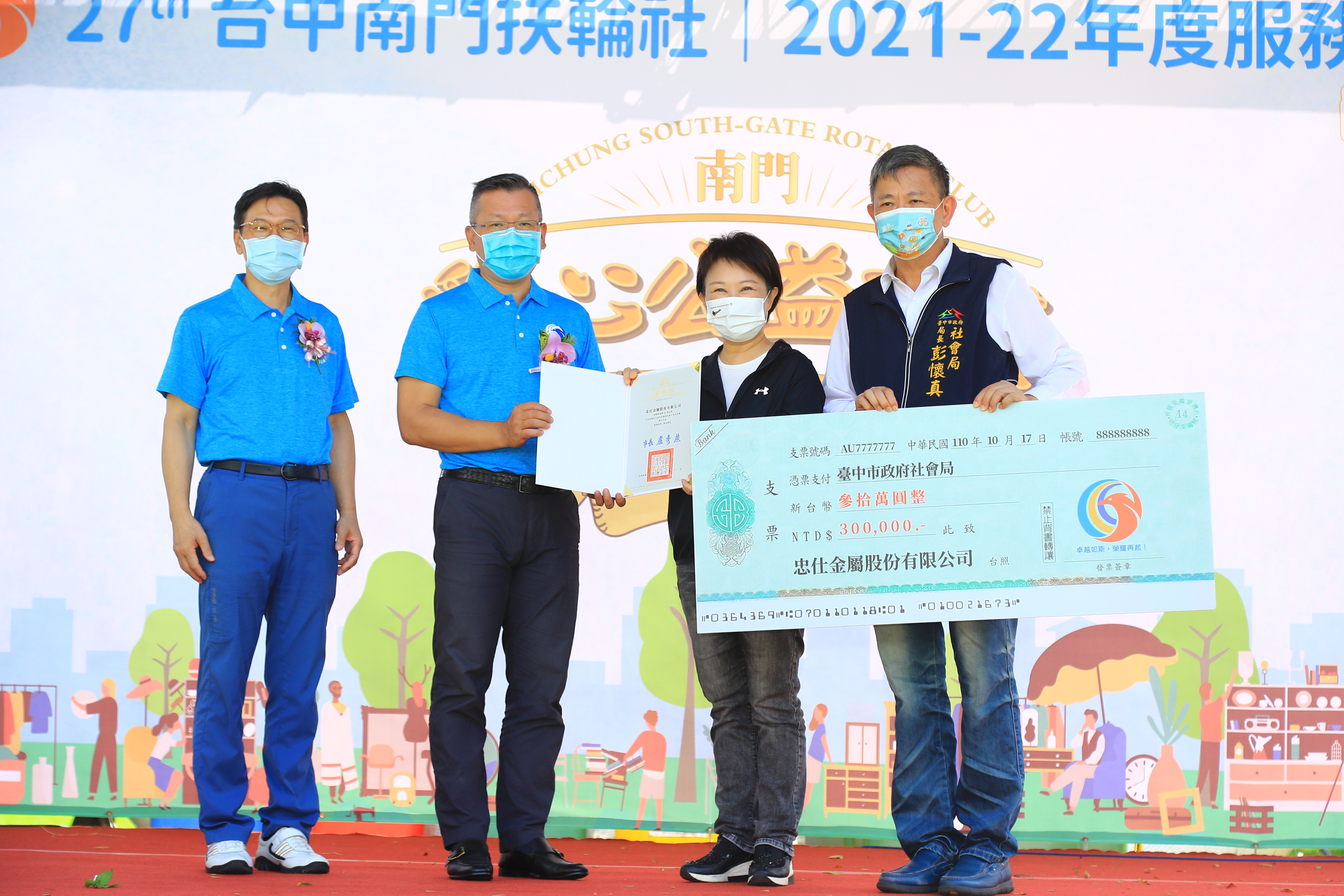 為協助街友打造溫暖的避風港,台中市政府社會局計畫修繕平價住宅,提供有就業意願或有工作能力的街友租屋需求。對此,台中南門扶輪社更慷慨解囊,捐贈30萬元添購家具,今(17)日舉辦公益慈善義賣市集暨捐贈儀式。台中市長盧秀燕出席代表受贈,並回贈感謝狀,感謝社友集結愛心,溫暖社會。