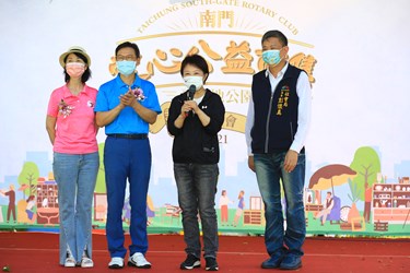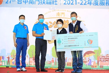 「有愛心的人必有福報!」盧市長指出,特別感謝扶輪社長期以來熱心公益,近來疫情趨緩,南門扶輪社率先舉辦愛心活動,除捐贈救護車給東勢農民醫院,也贈送一台交通車給藍迪兒童之家;此外,台中市政府修繕平價住宅提供街友租用,南門扶輪社更捐贈30萬元給街友添購家具,她要代表市府和全體市民,感謝南門扶輪社社友的愛心,希望讓愛的氛圍在社會飄香。