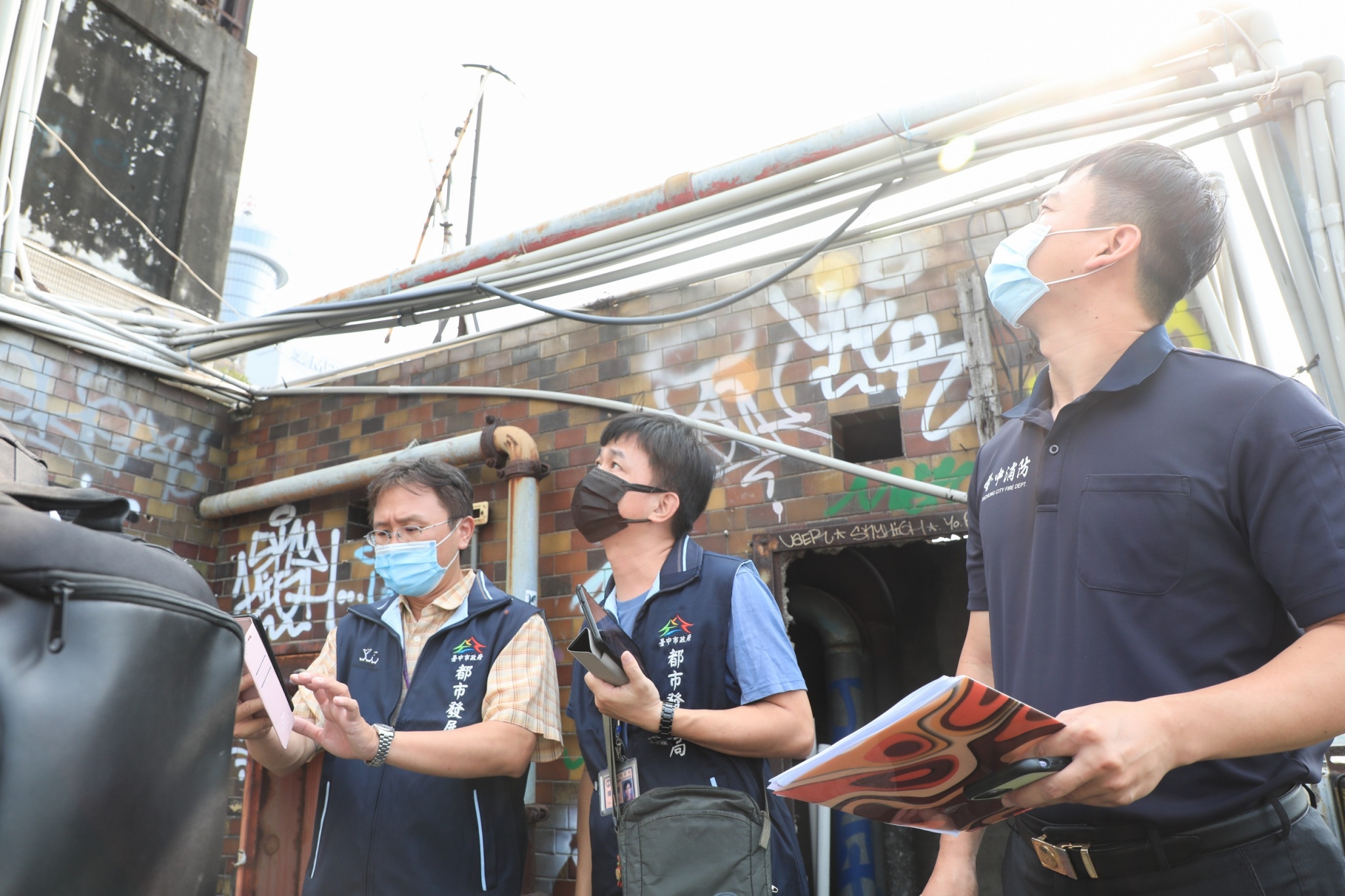 都發局指出,由於台中老舊閒置建築物,主要集中於中區,今日下午邀集消防局及相關單位聯合稽查千越綠川商業大廈、金殿888大樓,針對公寓大廈管理情形、消防設備、用火用電、大樓共用部分逃生避難動線、防火門、廢棄物、有無街友進入閒置荒廢樓層及場所大樓出入口有無違規停放車輛情形等方面進行稽查。