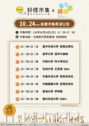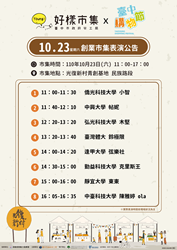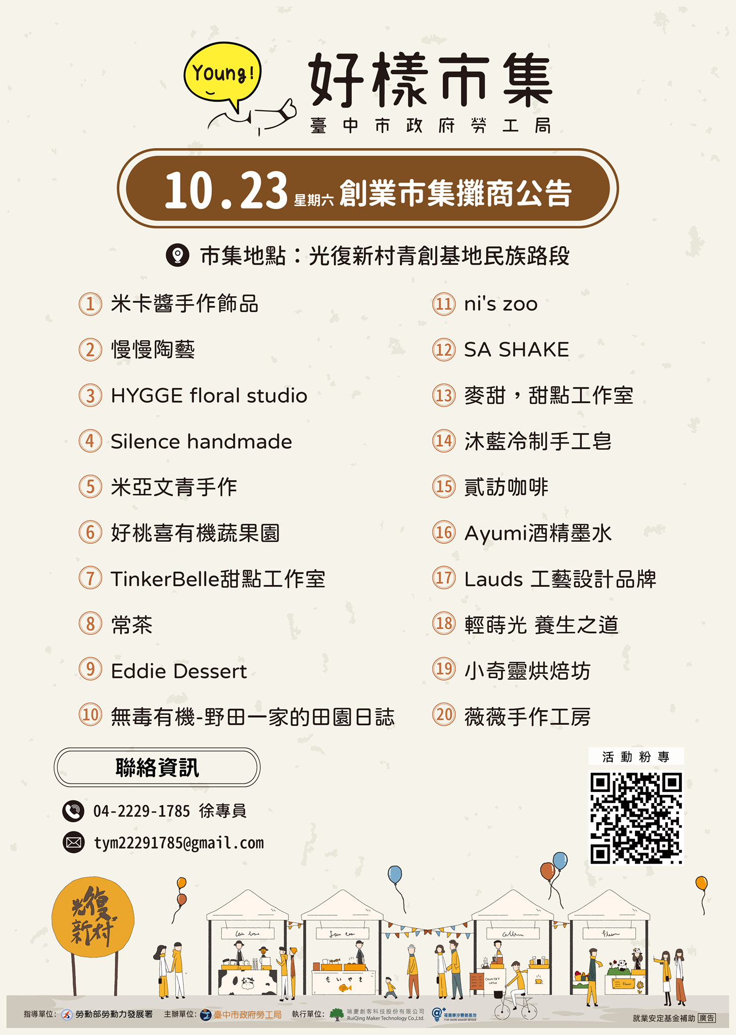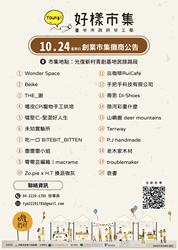 用心協助青年創業,台中市政府勞工局與台中各大學持續合作推動青年創業圓夢,於10月23、24日11時至下午5時在光復新村青創基地,舉辦今年第15、16場「Young!好樣市集」,由20組學生或創業青年團隊共同設攤,活動更結合台中購物節一起拚經濟,民眾到場購物可於台中購物節APP登錄發票,累積滿500元即可參加抽獎,歡迎踴躍參與。
