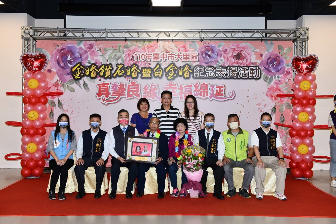 大里區公所今(23)日在台中市纖維工藝博物館地下室演講廳舉辦「110年金婚鑽石婚暨白金婚紀念表揚活動」,由副市長黃國榮及大里區長鄭正忠代表市長盧秀燕祝福在場結婚攜手超過50年以上恩愛的「牽手」夫妻,並祝福他們身體健康。活動會場特別致贈阿公阿嬤們客製化、獨一無二夫妻甜蜜合照的紀念獎牌、精美禮品及精緻伴手禮盒,並聘請專業攝影師拍下恩愛銀髮佳偶全家福照,讓受獎伉儷及親屬們留下美好回憶。
