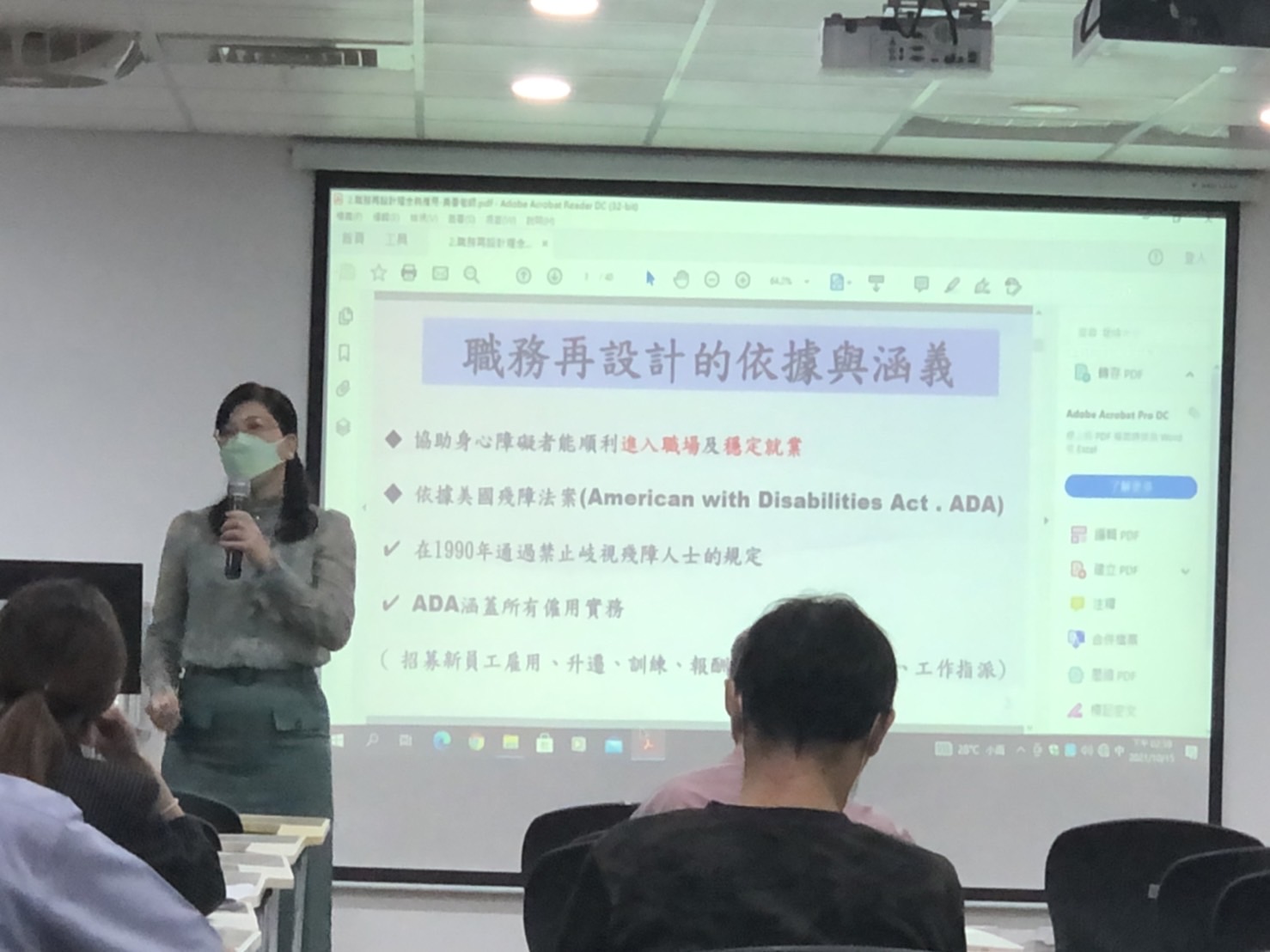 為解決公、民營事業單位對身心障礙者定額進用的疑惑,台中市政府勞工局日前舉辦身心障礙者定額進用法令宣導會,邀請到對於身障員工的接納度、包容度均為公私立機關之首的台中市立啟聰學校校長王敬儒演講,另由中山醫學大學職能治療學系教授陳美香,講授身心障礙者職務再設計的完整概念,並增加雇主瞭解法令的管道,盼藉此攜手雇主打造友善身障者的職場環境。