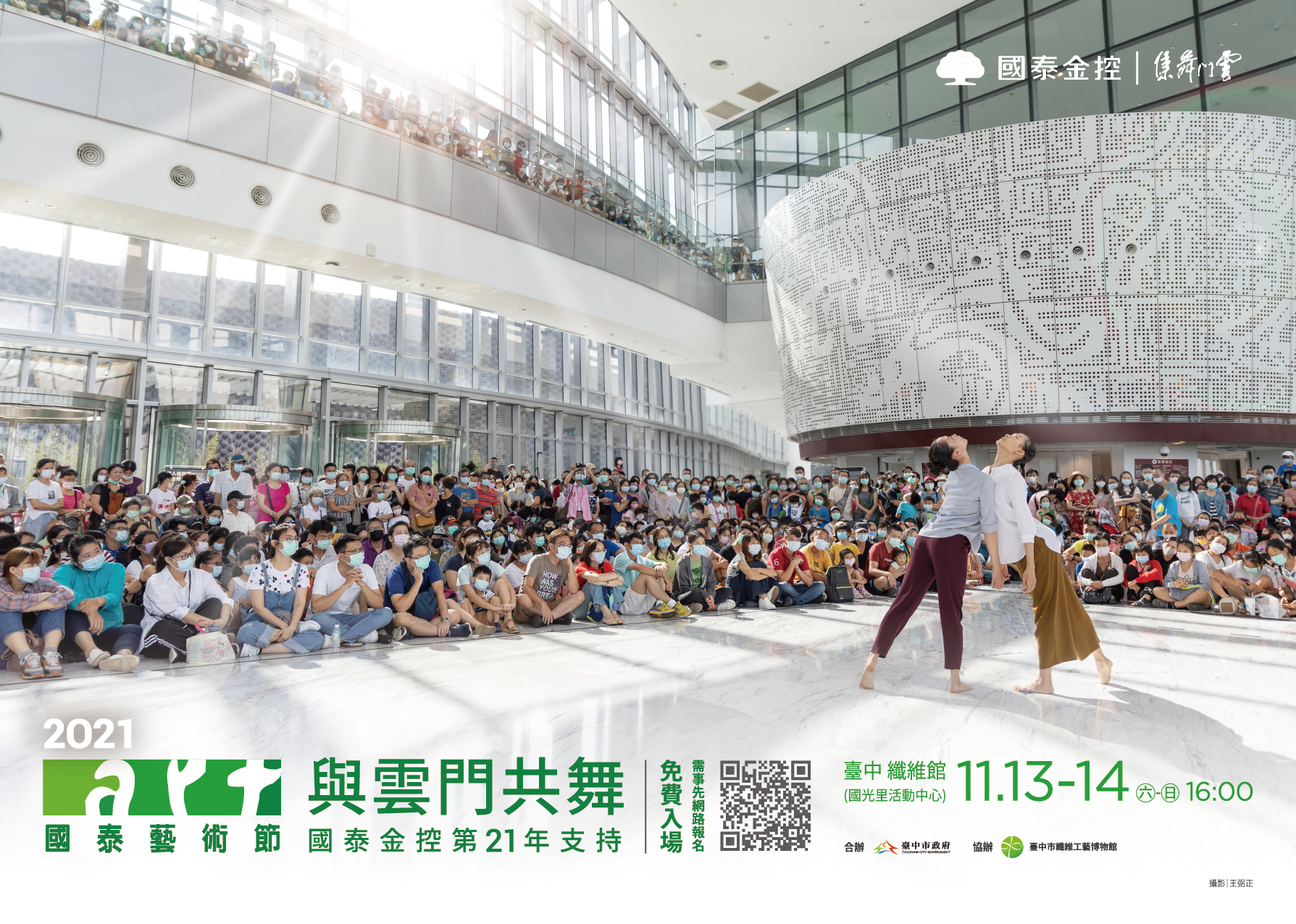 由國泰金控主辦、台中市政府與財團法人雲門舞集基金會共同合辦的「2021國泰藝術節―與雲門共舞(台中場)」公演,將於11月13日、14日下午4時,在台中市纖維工藝博物館旁的大里區國光里活動中心舉辦,並於11月3日中午12時起開放線上預約報名,免費入場,名額有限,喜歡藝文表演的觀眾朋友千萬別錯過!