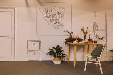 此外,此次展覽也特別邀請超過半甲子的老字號品牌「大振豐洋傘」,與日本花藝家木村貴史帶領的plantica花藝團隊,聯名設計「繽紛花漾傘」系列,雨傘搖身一變成為穿搭的時尚配件。身為國際珠寶競賽常勝軍的「磨樣 MODEYANG」,則將霧峰知名的「芋香米」意象,透過台灣玉、銀、檀木等媒材創作,用心刻劃在「玉(遇)在一塊」對筷組。玉與筷的結合,象徵夫妻一同共食、共享、共伴生活。