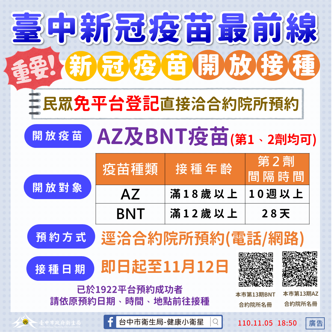 中央流行疫情指揮中心今(5)日宣布鬆綁疫苗使用規定,完成預約民眾依約報到並經醫師評估即可接種疫苗,不須湊足一定人數才可開瓶,並建議合約院所事先採取備選名單。台中市初估第13期接種結束後AZ與BNT疫苗有餘裕,已規劃由醫院、診所依疫苗類別分流開診,11月5日至12日免透過1922預約平台,BNT可逕洽合約院所、AZ疫苗則可洽台中市合約醫院預約。