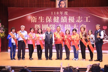 一年一度「衛生保健績優志工及團隊表揚大會」今(11)日在台灣大道市政大樓舉辦,共有93位志工接受表揚,志工依服務時數分別獲得「松馨獎」、「梅馨獎」與「蘭馨獎」,其中在台中榮總服務的唐秉貴,疫情期間帶領全家投入防疫工作,服務累計時數達16,228小時,榮獲「特殊貢獻獎」,副市長令狐榮達一一頒獎表揚,感謝衛生保健志工堅守崗位,才能讓台中市防疫網路更加健全。
