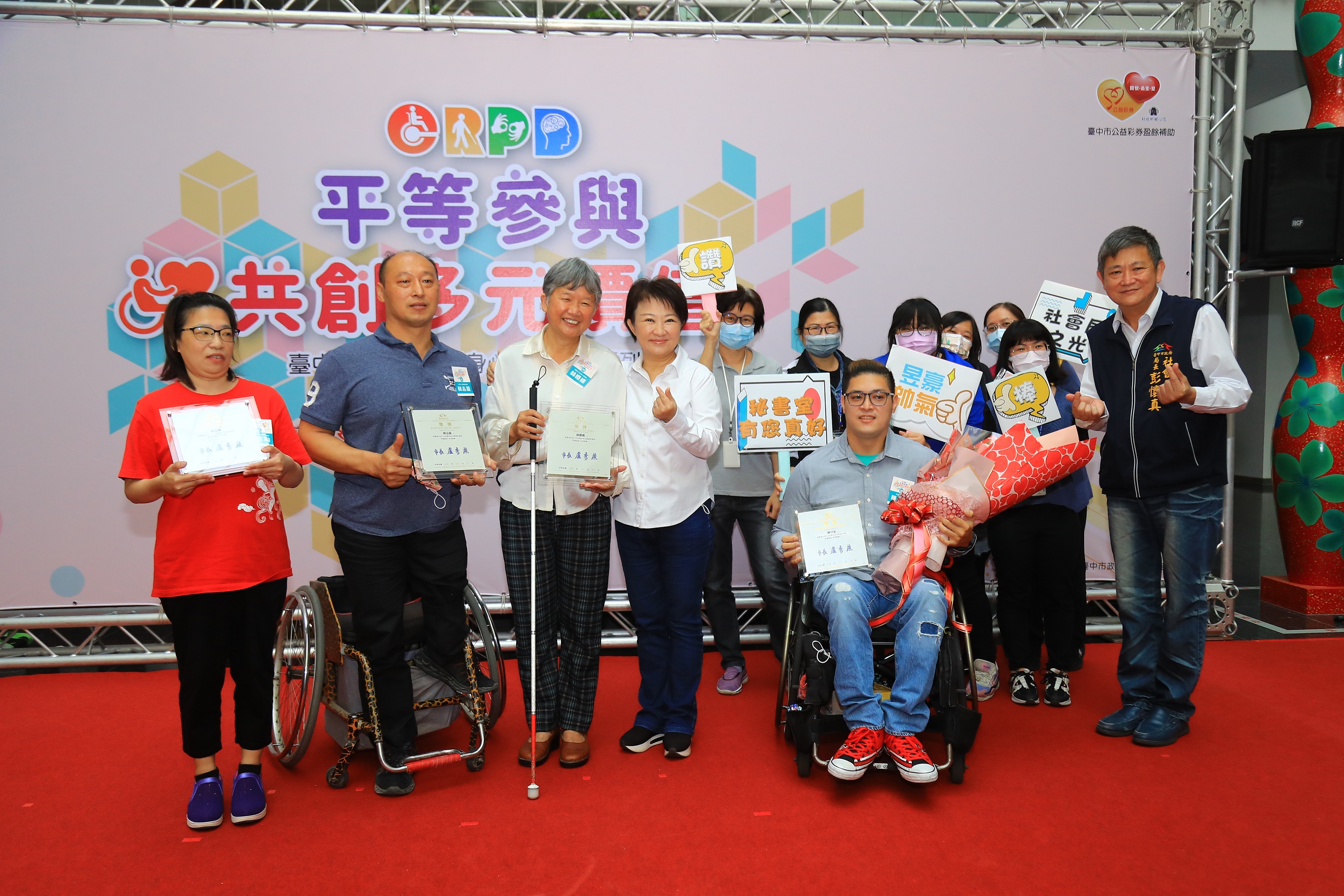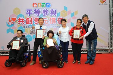 盧市長表示,12月3日為國際身心障礙日,台中市共有282萬登記戶口的市民,其中身心障礙人口就有近13萬人,今日特別表揚所有服務身心障礙的有功人員及身障獲獎者,感謝身障朋友們接受挑戰、超越障礙、發揮潛能,也感謝照顧者及專業人員的辛勞;她呼籲,不只在國際身障日重視此議題,更應在每分每秒重視及協助身障者。