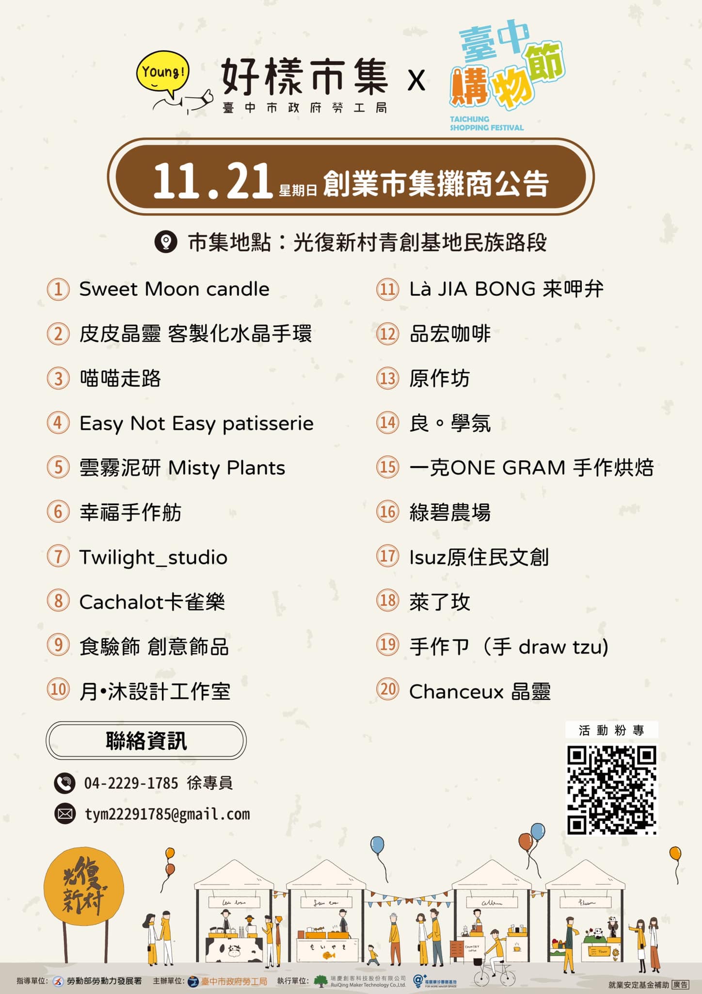 勞工局說明,疫情期間市集活動將做好全面防疫措施,採實聯制進場,落實全程配戴口罩、保持社交距離等防疫規定,維護攤主與遊客安全與健康。活動現場亦設有「台中市青年一站式創業服務站」提供創業諮詢服務,若有任何創業相關問題,可至攤位洽詢服務內容,亦可洽服務專線04-2229-1785(一起幫我),或來信 tym22291785@gmail.com 詢問更多一站式創業服務站及創業市集/課程/活動等資訊。(11/19*18)*勞工局