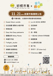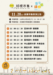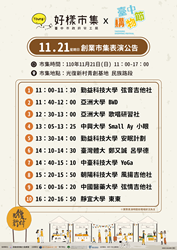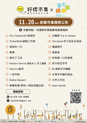 台中市政府勞工局與台中各大學合作舉辦的「Young!好樣市集」好評不斷,將於11月20、21日11至17時在光復新村青創基地,舉辦今年度最後的第19、20場,兩場市集皆有20組學生或創業青年團隊共同設攤,有手作甜點、創意商品等,邀請民眾把握*機會至現場選購屬意的特色商品。