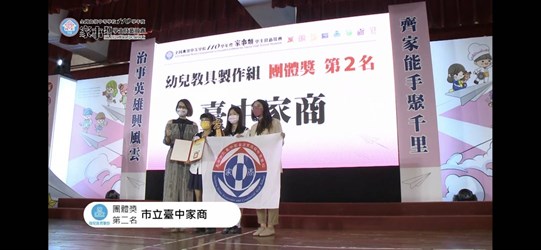 台中家商周妤慈及陳筠昕同學榮獲幼兒教具製作組金手獎,使台中家商獲得幼兒教具製作團體獎全國第二名佳績;受疫情影響,暑假期間由指導老師游依靜以遠距方式培訓,廣邀科內有意參與全國賽的同學共同學習成長,幼兒教具製作職種校內初賽8月底舉辦,最後由周妤慈與陳筠昕同學出賽,歷經2個多月密集培訓,2位選手始終秉持專注、努力、認真的學習態度,最終在全國賽中摘下得來不易的雙金手獎。