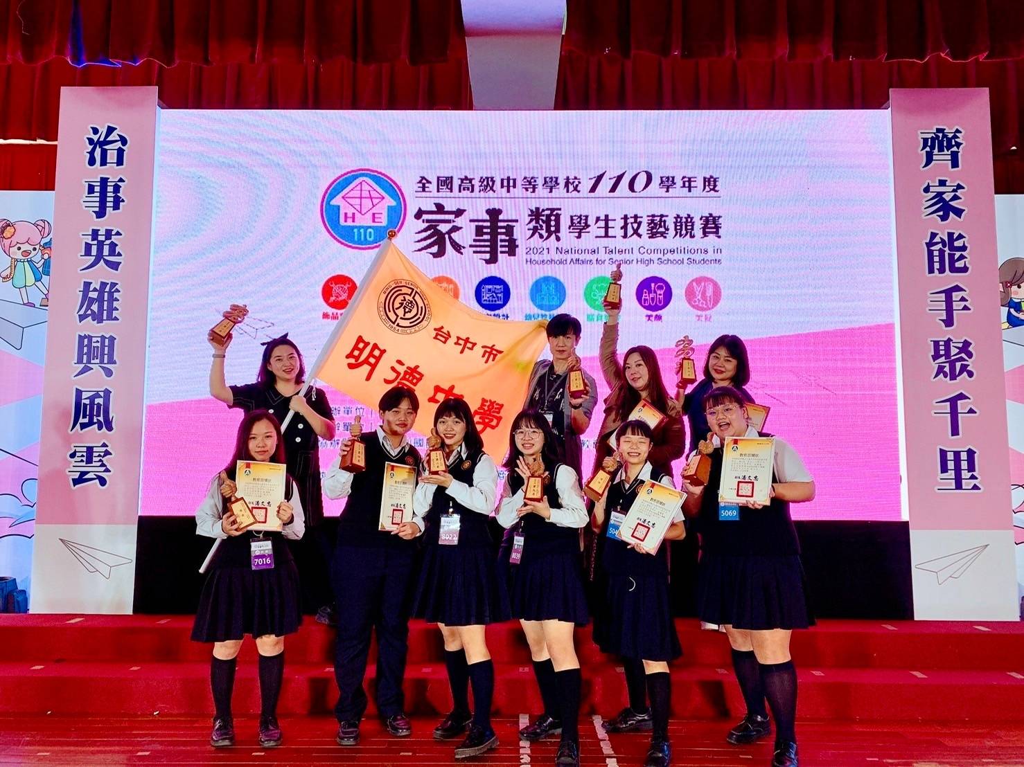 110學年度全國高級中等學校技藝競賽「家事類」成績出爐!台中市明德高中拿下團體獎美顏全國第一名、美髮全國第二名、幼兒教具製作全國第四名;明台高中勇奪團體獎室內設計全國第一名;台中家商榮獲團體獎幼兒教具製作全國第二名;僑泰高中榮獲服裝製作組金手獎全國第四名,共計獲得8座金手獎。