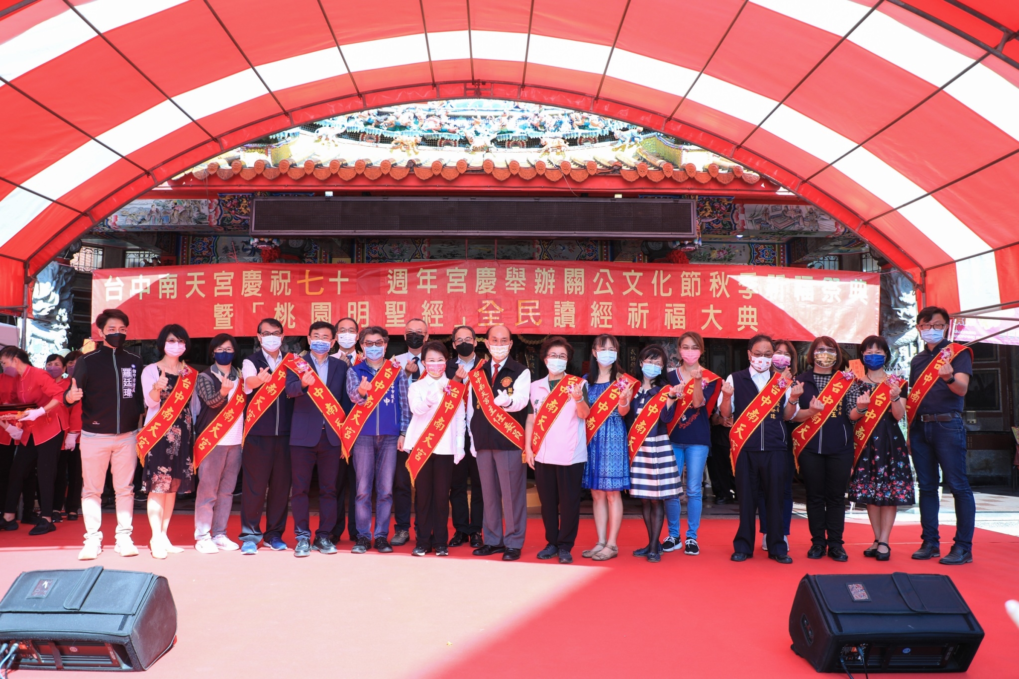 台中南天宮今(21)日舉辦70週年宮慶,遵循古禮舉行三獻大禮團拜祈福,同時表揚160位國中小孝行楷模,弘揚孝道正能量。市長盧秀燕前往致慶表示,感謝南天宮樂捐助學裝冷氣,全市高中職以下近350所學校,今年底或明年初冷氣將全數裝設,新冠疫苗第1劑接種已破8成,購物節消費登錄金額飆到161億元,拚經濟全台遙遙領先。