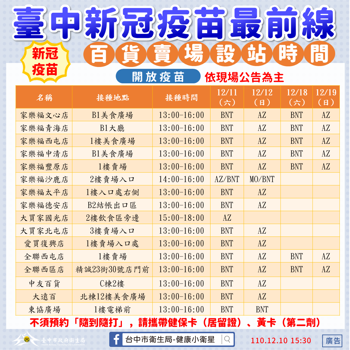 為提升接種效率,台中百貨賣場接種站疫苗選定,統一以週六接種BNT疫苗、週日接種AZ疫苗為主,部分站點因應人力及場地規劃微調疫苗種類,家樂福沙鹿門市週六提供BNT及AZ、週日提供BNT及莫德納;另大買家國光店週六、日均開設AZ接種站;東協廣場二日均接種BNT疫苗,歡迎民眾依據疫苗需求種類就近接種。