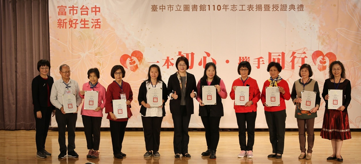 台中市立圖書館志工團隊表現耀眼,今年除榮獲文化部「第28屆全國績優文化志工」團體獎、2名優質志工獲頒個人銅質獎,還奪得衛生福利部「全國績優志工」178銅、「台中市志願服務獎」一、二及三等獎,以及市立圖書館績優服務等各類獎項肯定。今(12)110年志工表揚暨授證典禮,文化局長陳佳君代表市長盧秀燕出席,向今年服務總時數超過15萬小時的2千名圖書館志工致敬。