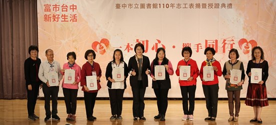 中市圖指出,圖書館志工們是有組織、有能力、有創意的團隊,成員有退休校長、老師、企業主管、會計師等各領域人才,也包含新住民志工等。今年特殊貢獻獎共有3名志工獲表揚,服務於大肚瑞井分館的許展維、黃月,協助維護圖書館周邊環境不遺餘力;服務南屯分館陳韻彤女士除擔任故事劇團成員,也積極媒合動保處及其它社區單位與圖書館合作。
