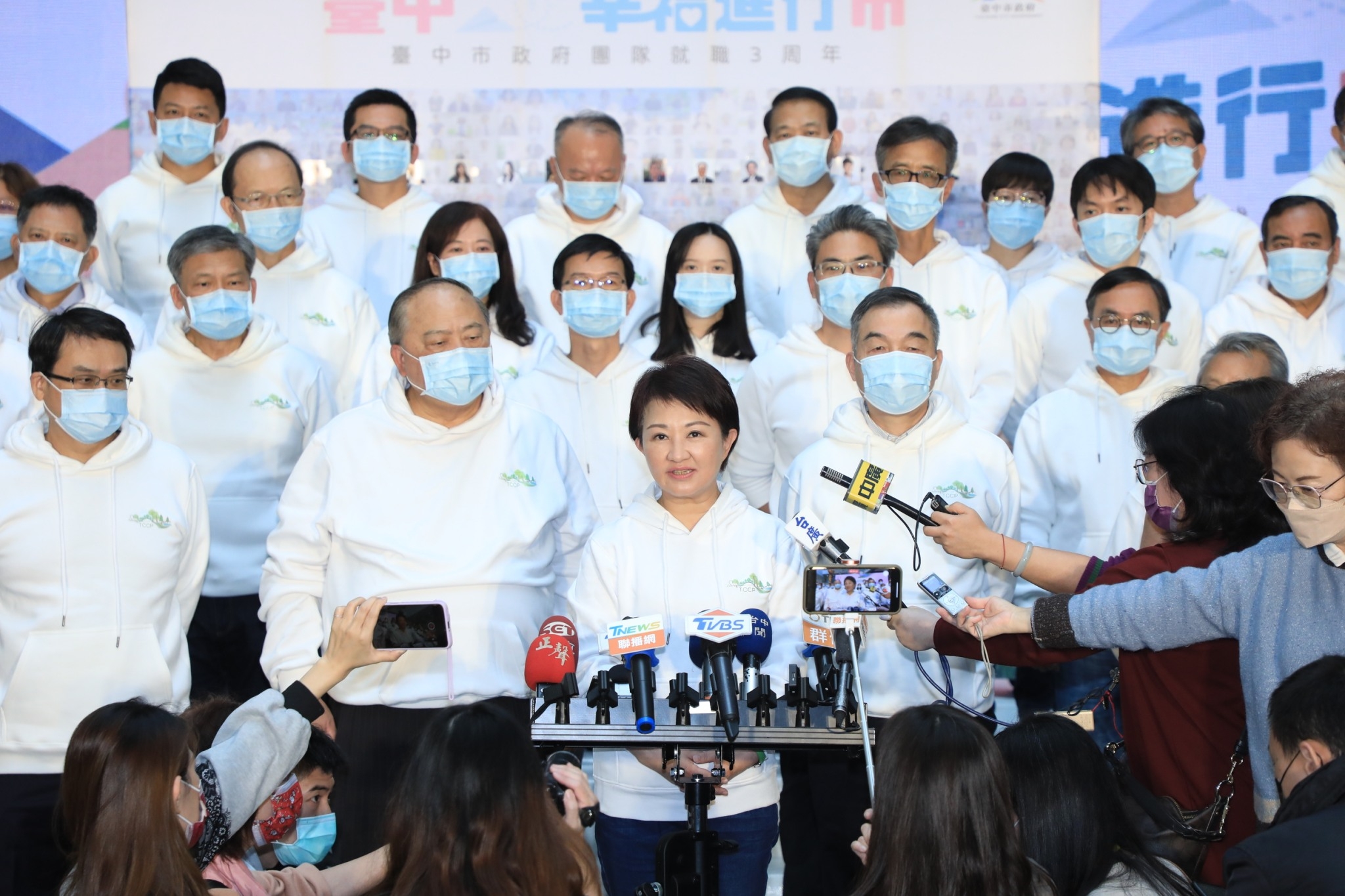 盧市長說,今年防疫大家都非常辛苦,在全體市民和市府同仁的共同努力下,今天才得以舉行就職三週年記者會。台中市的疫情雖然比較平緩,但是市府不會鬆懈。她強調,此屆任期還剩下一年,市府仍會全力以赴,為這座城市繼續努力,讓市民宜居幸福好生活。「謝謝大家給我這個機會!」每一天每一個腳步,市府都會陪同市民一起前進,「我們會繼續努力」。